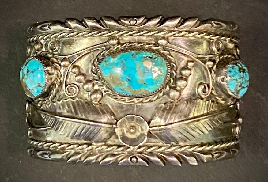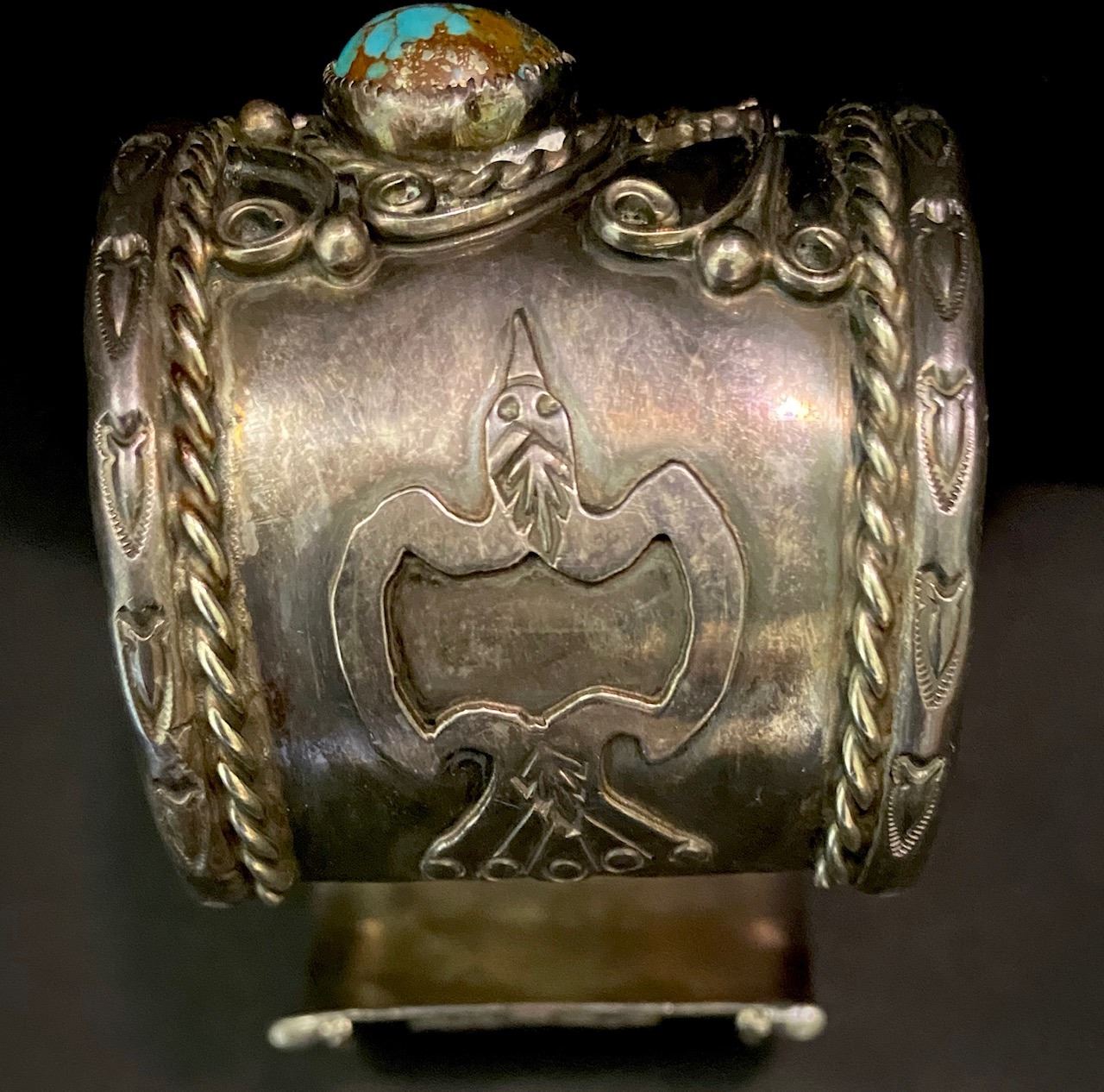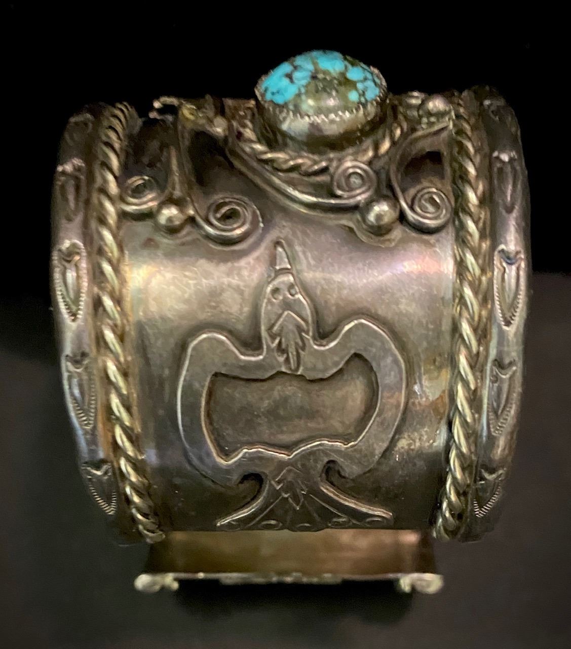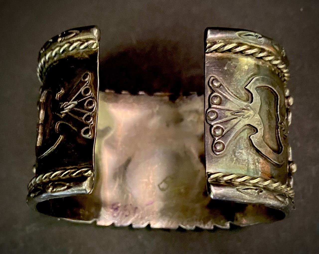 Bracelets measurements are opening, inside circumference, height. Weights are in Grams and are weighed to the best of our ability. The term signed means that, in our opinion, the signature is by the artist. All dating, Turquoise and hallmark attributions are to the best of our knowledge. Attributions are subjective and should be taken as such. Attributions in the description of any lot is left to the buyer to determine accuracy and the gallery is not responsible for any errors or omissions.