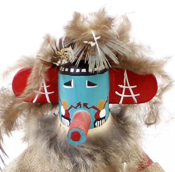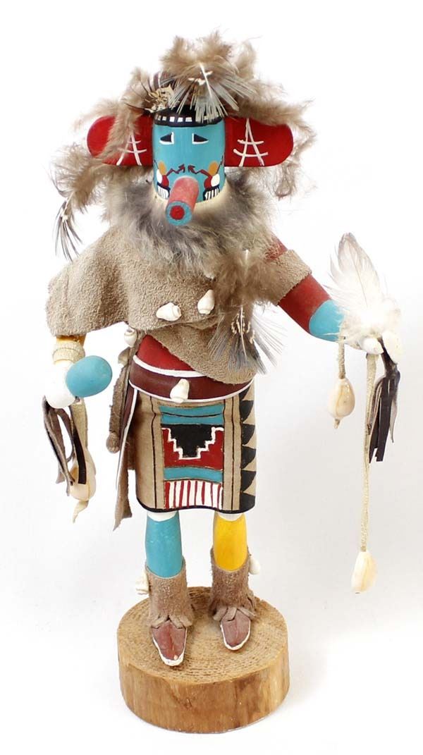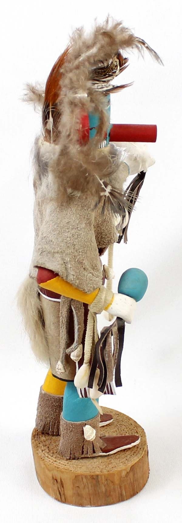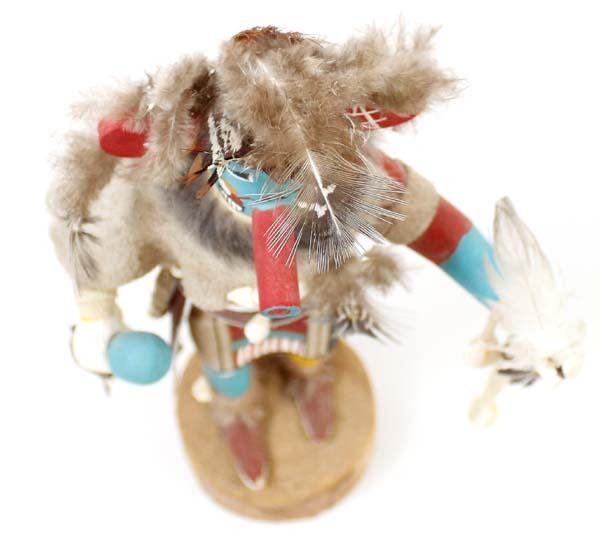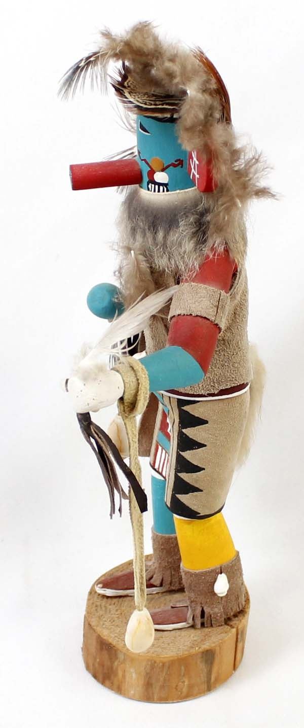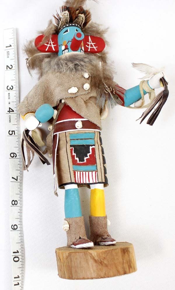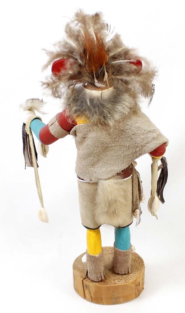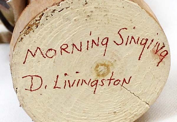 Native American Navajo Morning Singing Kachina by D. Livingston, measures 5'' x 11'' x 4'' and is signed on the bottom, embellished with feathers, leather, shealls, rabbit fur, and painted cloth