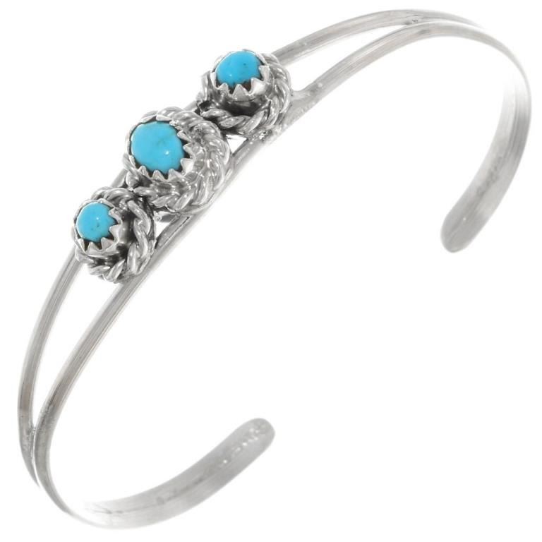 I (1) Cuff bracelet decorated with five small turquoise stones and (1) baby cuff bracelet featuring three small turquoise stones. all set in sterling.