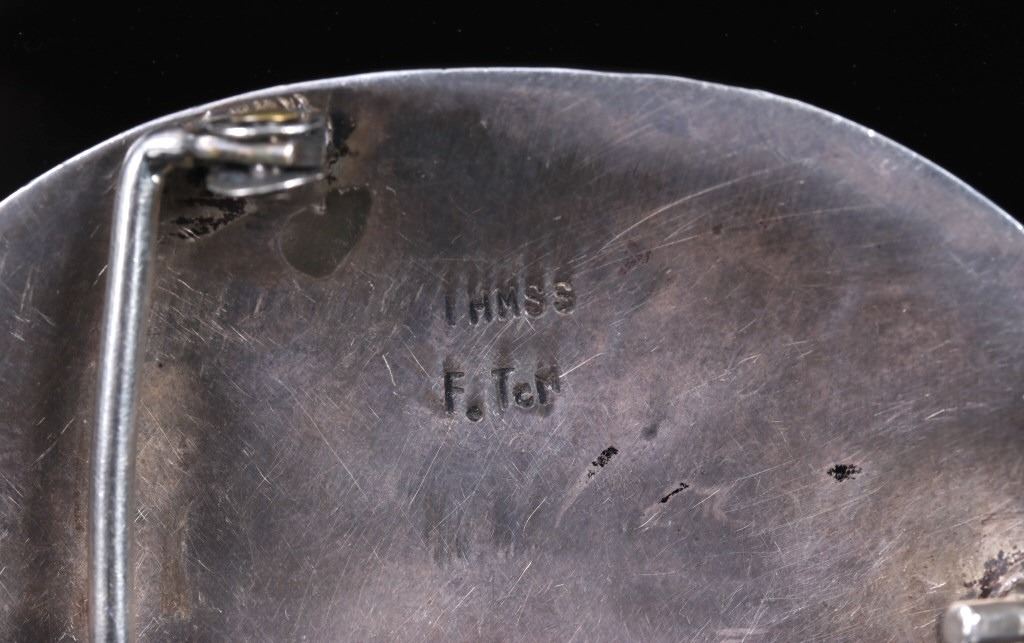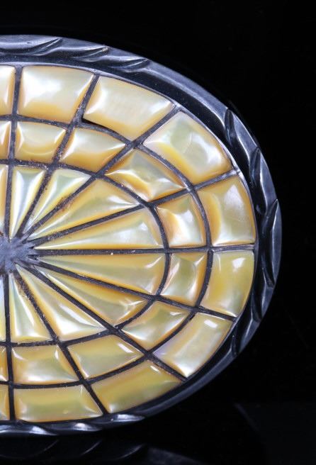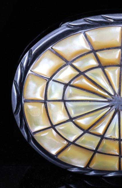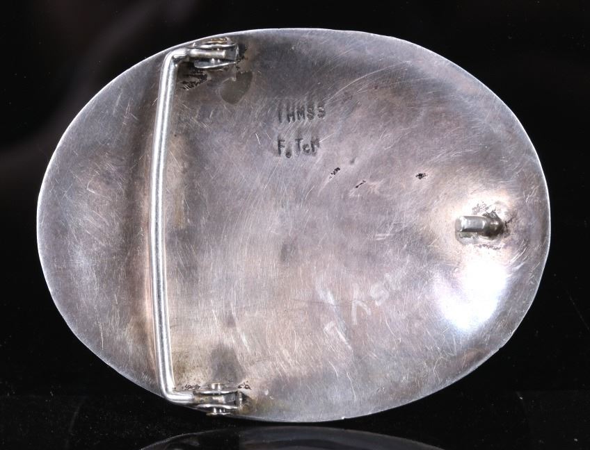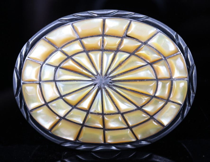 For your bidding pleasure is a Navajo Native American Indian sterling silver and mother of pearl belt buckle. This hallmarked sterling silver buckle is stamped "IHMSS" confirming the silver's purity. The belt buckle contains 48 individual mother of pearl gemstones. This piece is in wonderful shape. The buckle shows heavy sterling silver construction, done masterfully with a stained glass inlaid mosaic pattern. The mother of pearl pieces all have a rounded polished cabochon finish complimenting the mother of pearls iridescent reflection. It reflects its age but shows little to no tarnish. The buckle measures 3" x 2.5".