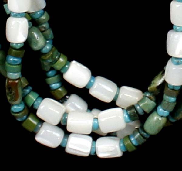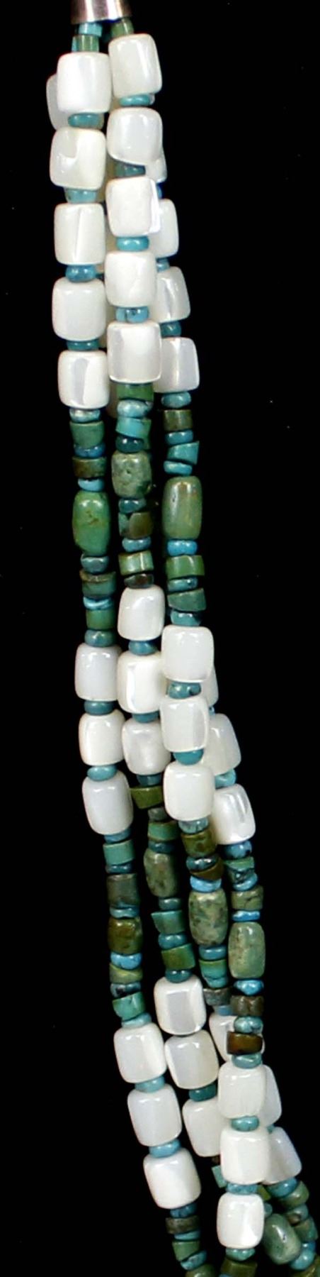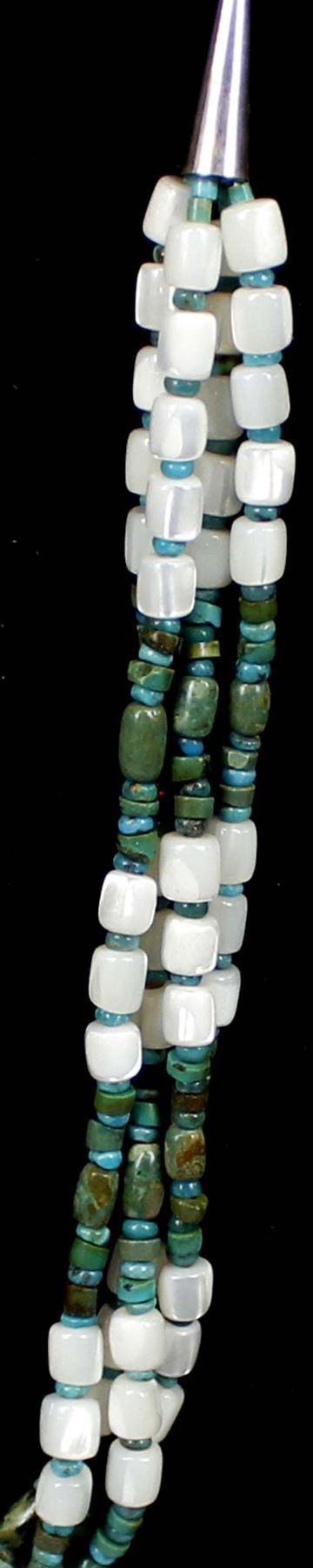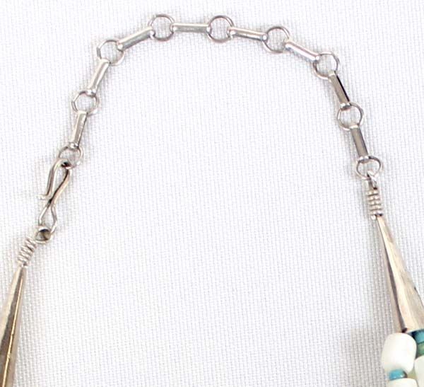 Navajo Mother of Pearl & Turquoise Heishi Necklace with sterling silver cones and closings. Measures 16'' end to end. Hand wrought chain.