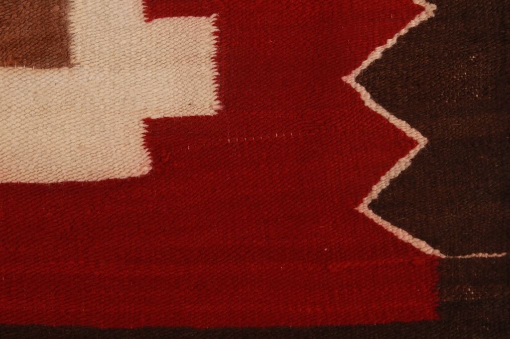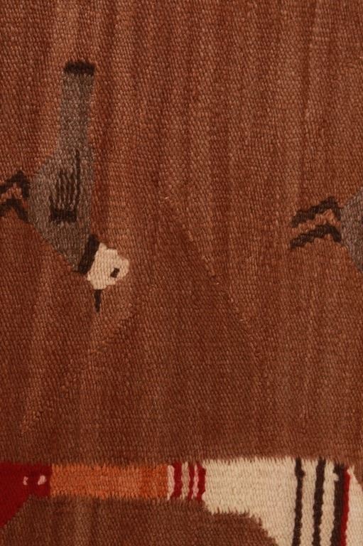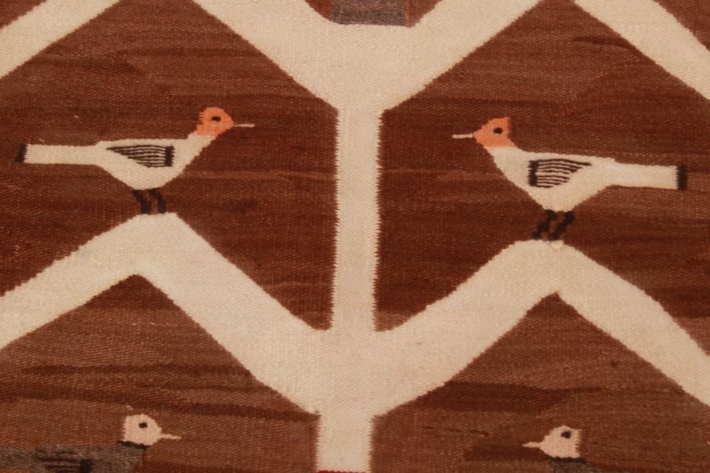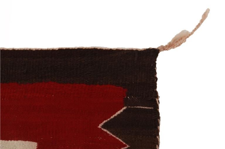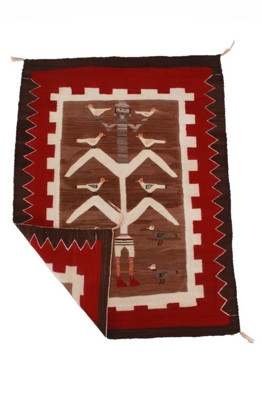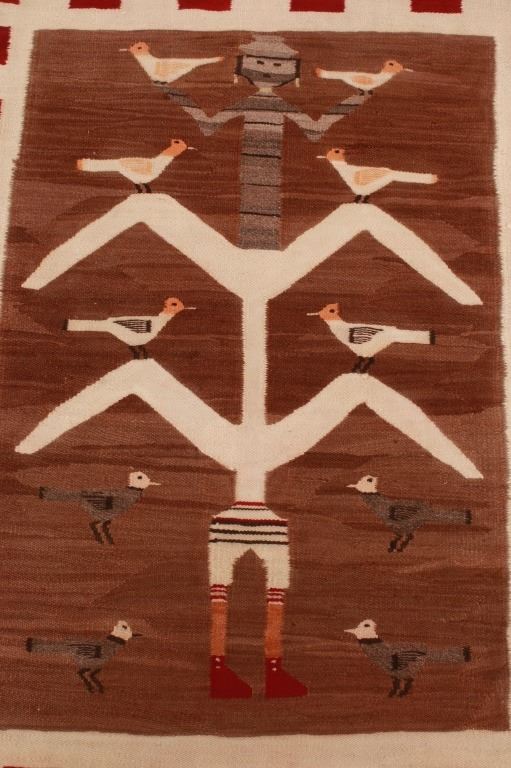 Featured in this lot is this Navajo Motif Tree of Life pictorial rug circa 1910 - 1920's. The rug features a wonderfully and professionally crafted wool construction that is extremely finely woven that shows a large amount of Lazy Lines featured in the light brown field and shows the traditional motif's of birds on either side of the Tree of Life with a ceremonial figure at the top of the Tree of Life. These rugs are highly sought after and signifies an important tie between the Navajo and the world around them, then the Tree of Life rugs may help you find your own connection with the world. The border includes includes layers of off white coloration, red and zig zags of dark brown. The rug also includes Spirit Lines into the corners of the rug. The Tree of Life Navajo Rug, often referred to as the Cosmic Tree. Since their early days of the late 1800s, these weavings have often portrayed pictures of a wedding basket with a corn stalk springing forth, birds, and rainbow bars. These pictures are meant to represent progression and movement within life, as well as the connections between the Navajo, the Earth, and the Universe. Known for their remarkable beauty and iconic images, the fact remains that even today the Tree of Life rug design remains a meaningful symbol to the Navajo people. It’s so important, in fact, that they’ve even been the inspiration behind SandPaintings and other artistic endeavors. A wonderful choice for celebrating the natural world and helping people reconnect and harmonize with nature, the Tree of Life is admired for its scenic designs and it’s fresh world perspective. From the Navajo ceremonial perspective; the Blue birds are considered the messengers to the gods and rainbows represent life and all things good. The condition of this Navajo rug is good with no obvious signs of damage and shows good overall condition. The measurements of this Navajo rug is 50 1/2" x 43". The thread count of this rug is 180 threads per square inch.