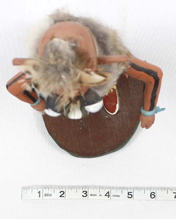 Native American Navajo Mud Head Kachina by C. Y. Begay, measures 5'' x 9'' x 5'' and is signed on the bottom, embellished with rabbit fur, leather, and feathers, old Trading Post Kachina