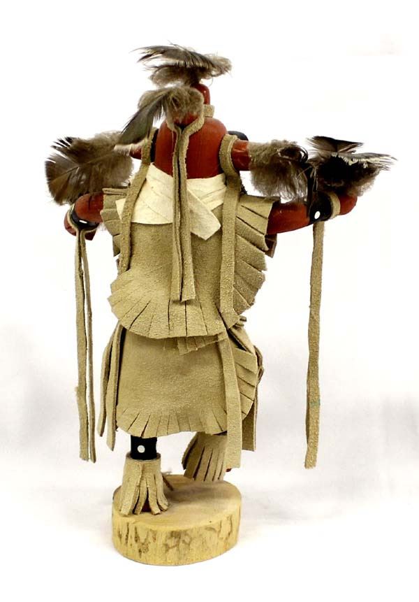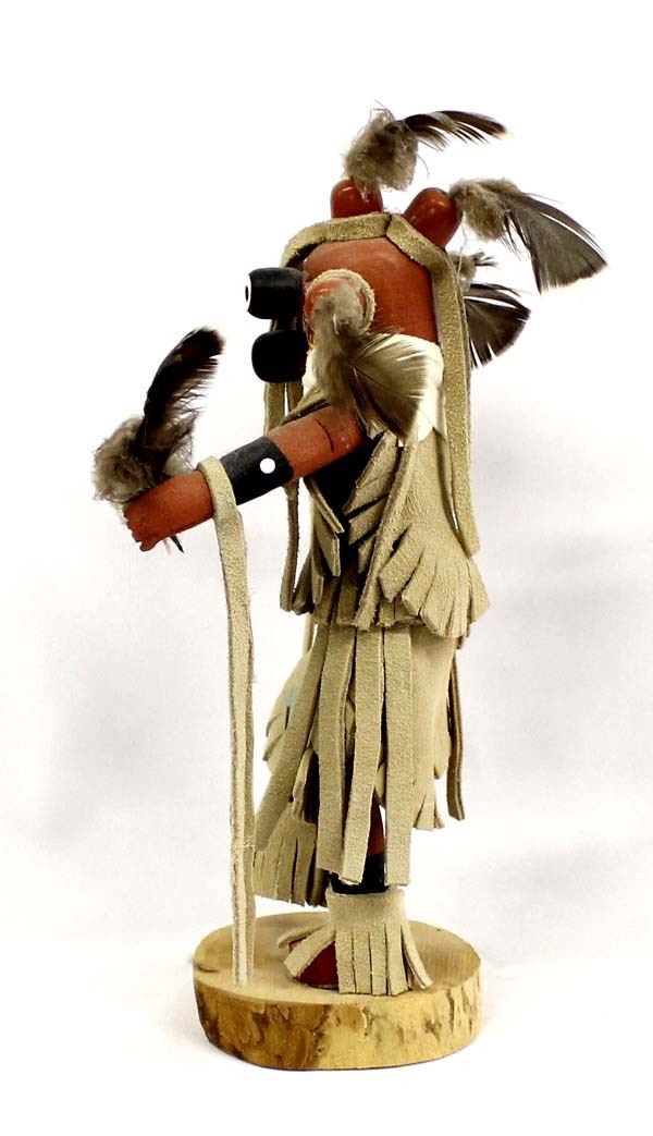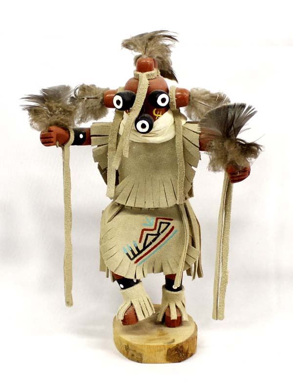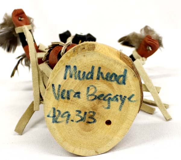 Native American Navajo Mudhead Kachina by Vera Begaye, measures 4'' x 12'' x 8'', signed by artist and embellished with leather and feathers