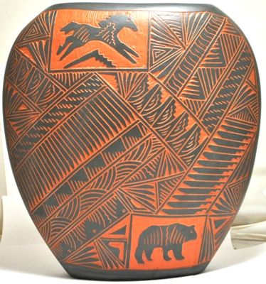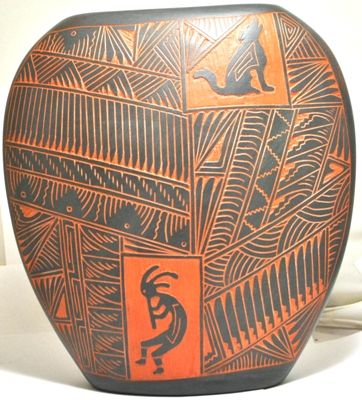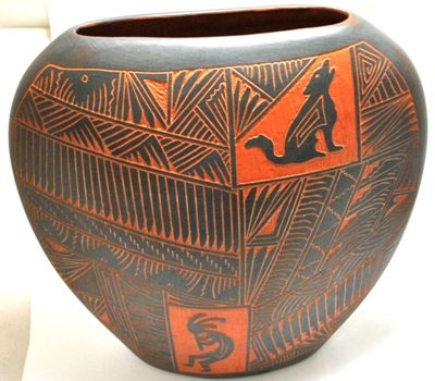 Navajo Multi-Animal & Kokopelli Etched Pottery - V.K.