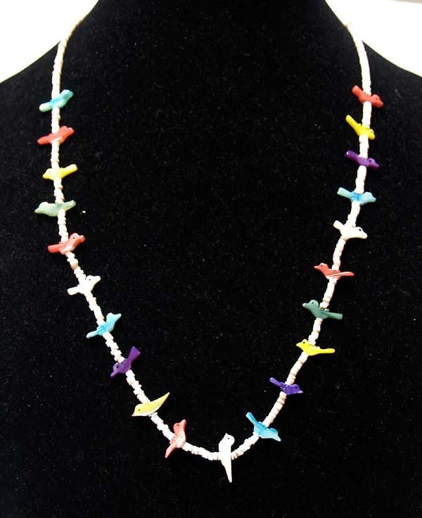 Native American Navajo Multi-Colored Bird Fetish Necklace, measures 26''L end to end, shell heishi