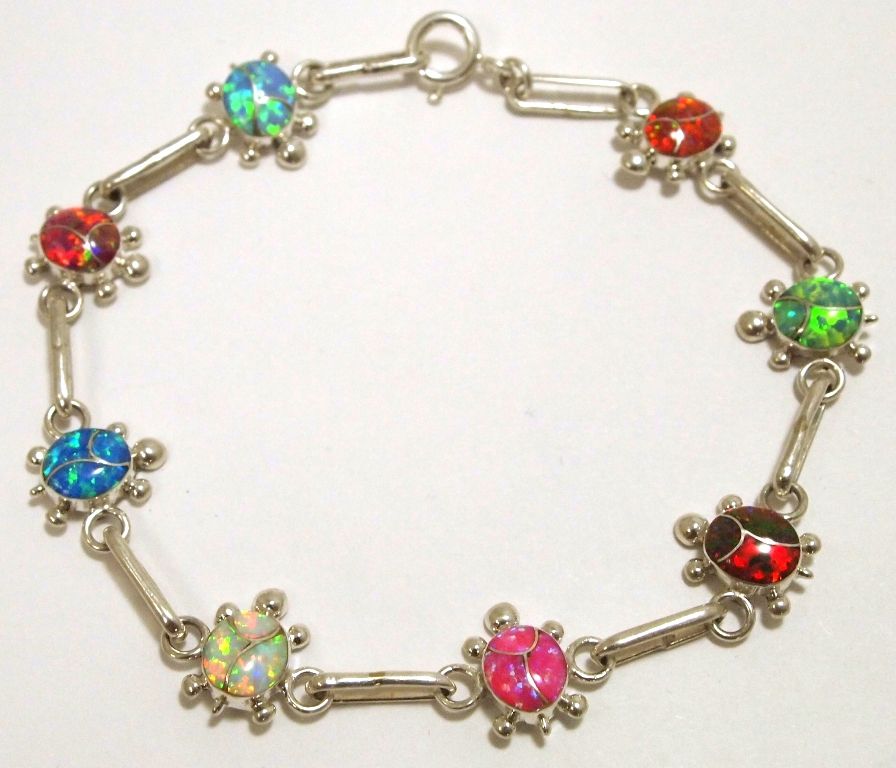 Measures 8" long by 7/16" wide (turtles), 1/8" wide (links). Stones may vary in both type and order; stones that may be present: White Opal, Light Blue Opal, Ocean Blue Opal, Green Opal, Pink Opal, Matte Pink Opal, Red Opal.