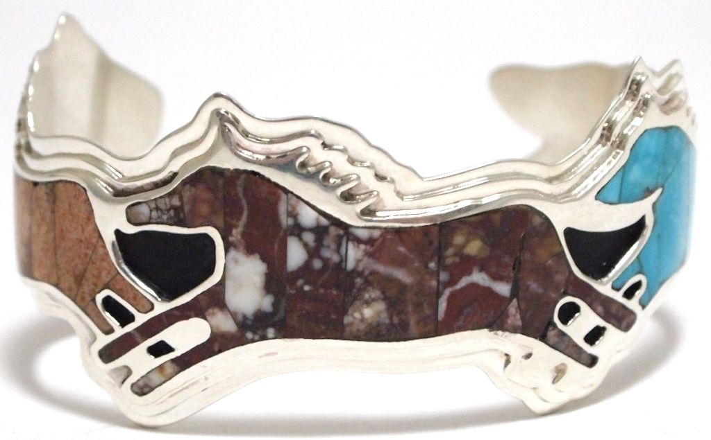 Navajo Multi-Stone Inlay Sterling Silver Horses Cuff Bracelet - Francis