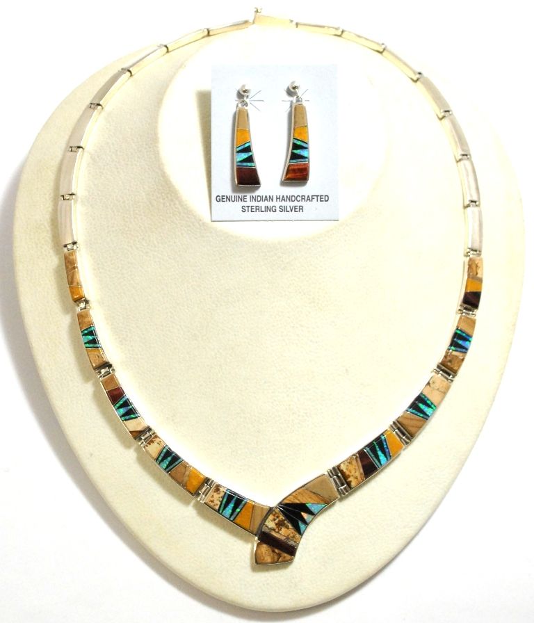Navajo Multi-Stone Inlay Sterling Silver Link Necklace & Post Earrings Set - Calvin Begay