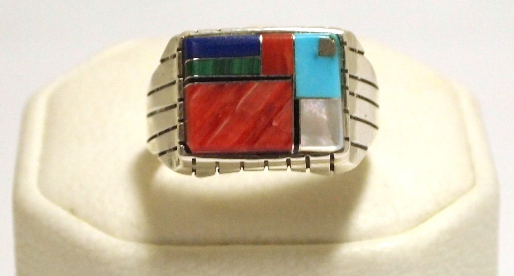 Inlay measures 7/16" tall by 9/16" wide. Band measures 1/8" wide, size: 10.75. Stones present: Spiny Oyster, Malachite, Lapis Lazuli, Mother of Pearl, Turquoise, Onyx.