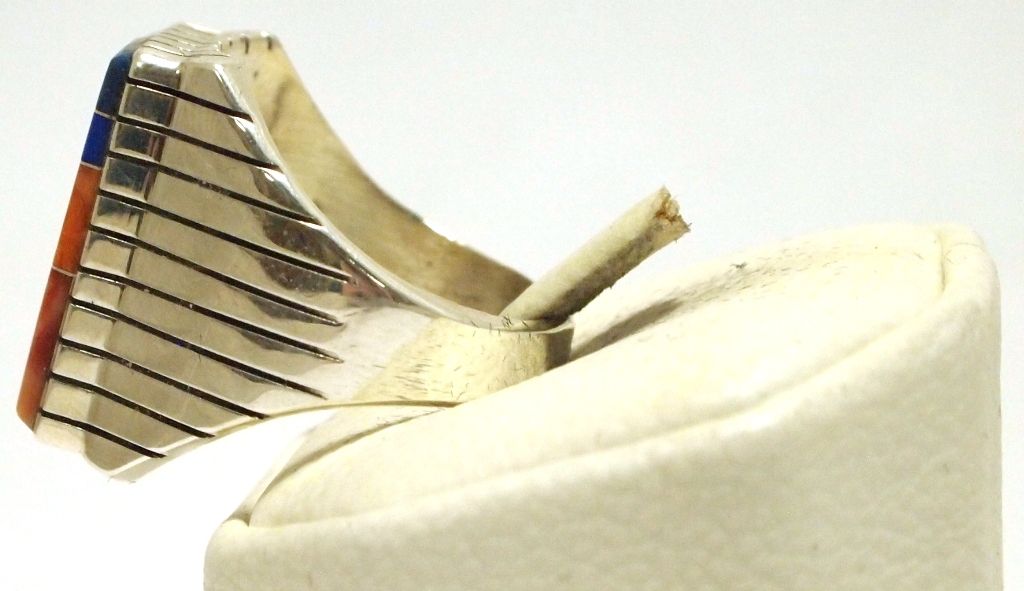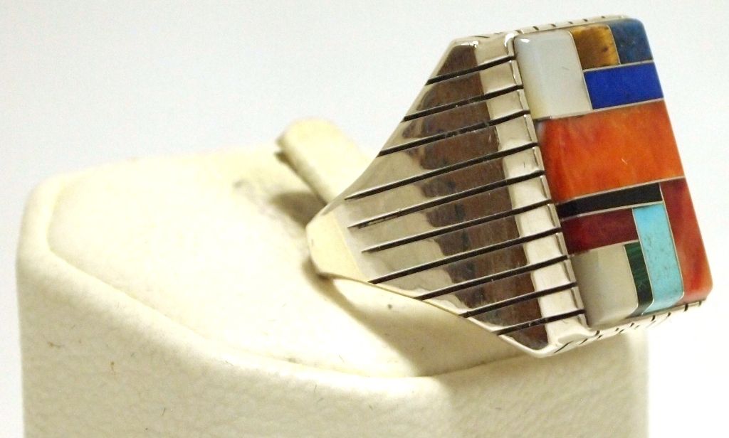 Inlay measures 7/8" tall by 9/16" wide. Band measures 3/16" wide, size: 12.75. Stones present: Spiny Oyster, Coral, Turquoise, Lapis Lazuli, Denim Lapis, Tiger's Eye, Mother of Pearl, Malachite, Onyx.