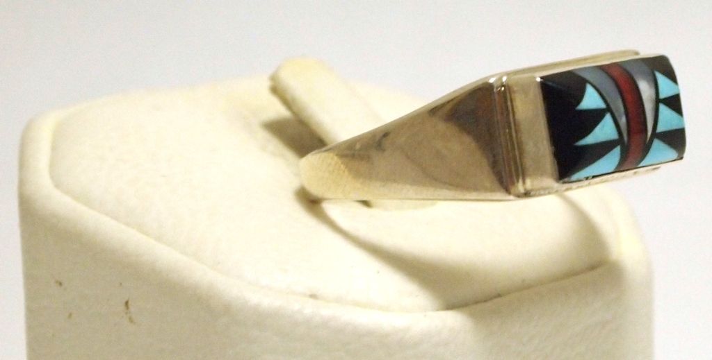 Inlay measures 5/16" tall by 9/16" wide. Band measures 1/8" wide, size: 14.5. Stones present: Coral, Turquoise, Mother of Pearl, Black Jet.