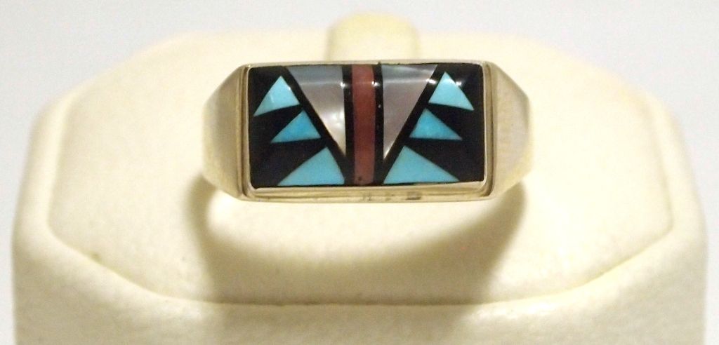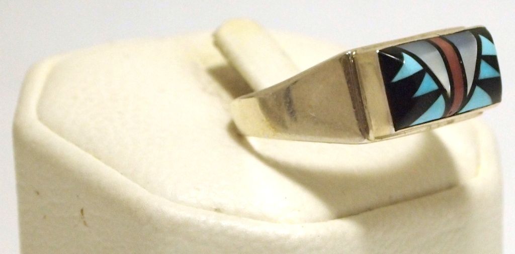 Inlay measures 5/16" tall by 9/16" wide. Band measures 1/8" wide, size: 11.75. Stones present: Coral, Turquoise, Mother of Pearl, Black Jet.