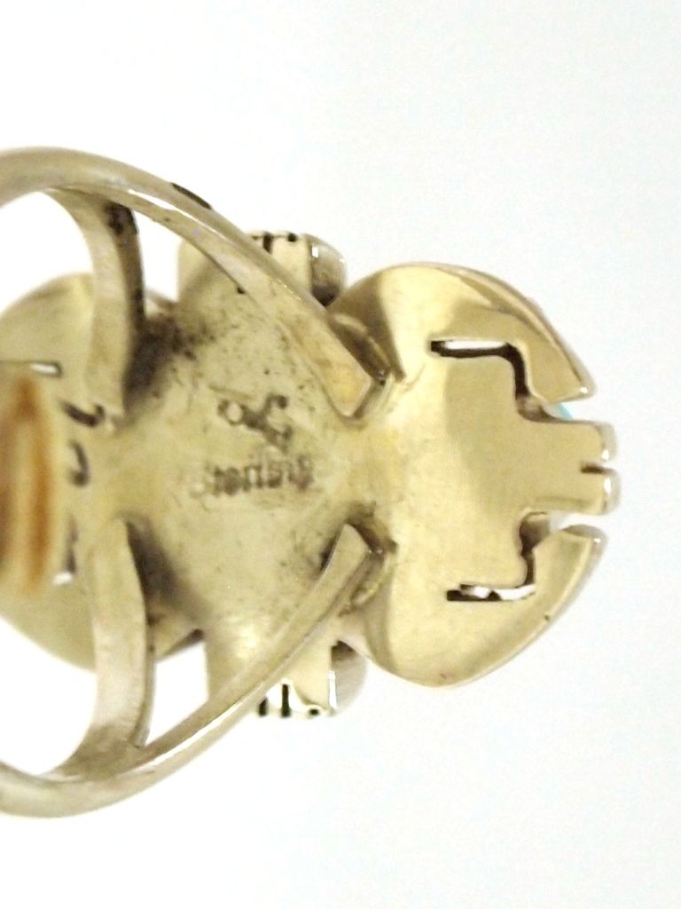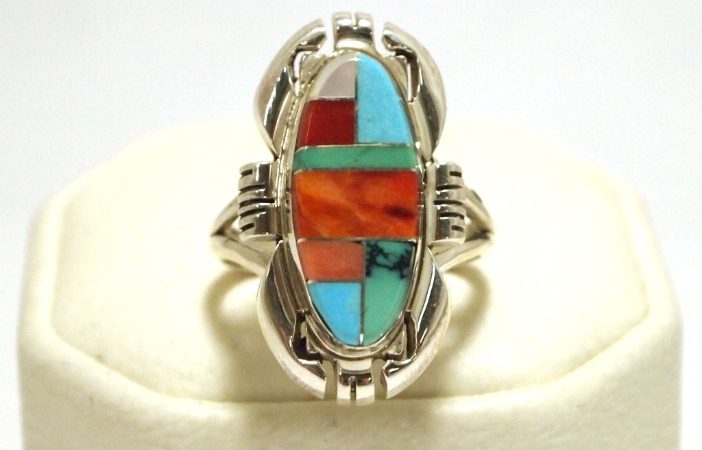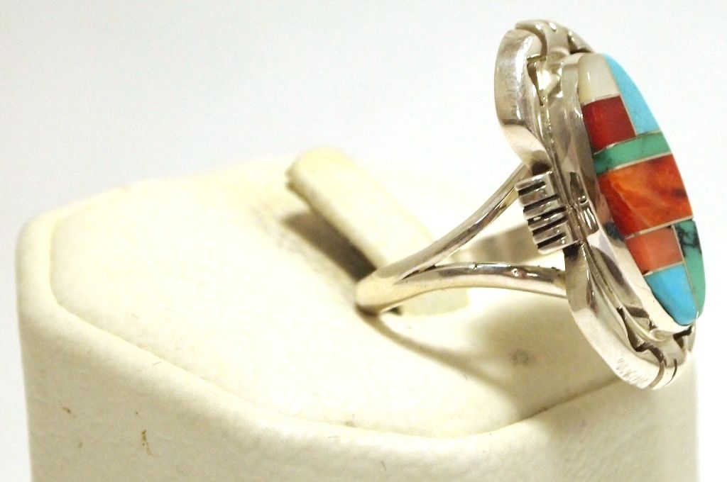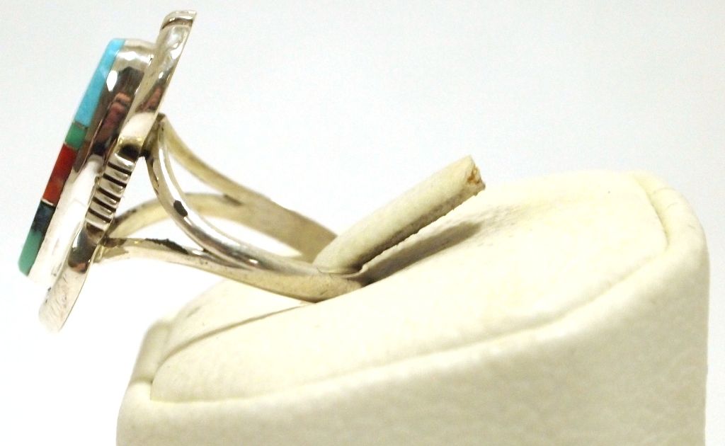 Inlay measures 3/4" tall by 5/16" wide. Face measures 1" tall by 1/2" wide. Band measures 1/8" wide, size: 8.25. Stones present: Spiny Oyster, Mother of Pearl, Turquoise, Coral.