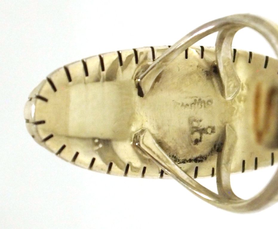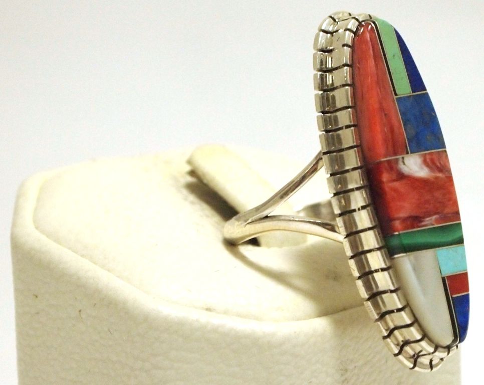 Inlay measures 1-3/8" tall by 7/16" wide, face measures 1-1/2" tall by 5/8" wide. Band measures 1/8" wide, size: 8.5. Stones present: Mother of Pearl, Spiny Oyster, Turquoise, Green Turquoise, Malachite, Coral, Lapis Lazuli.