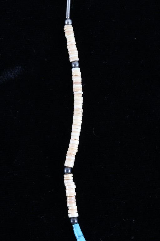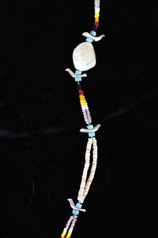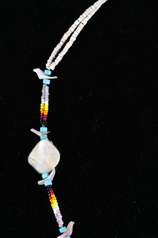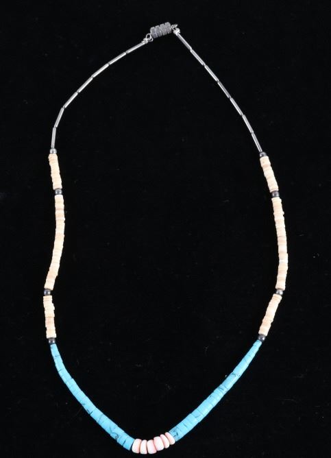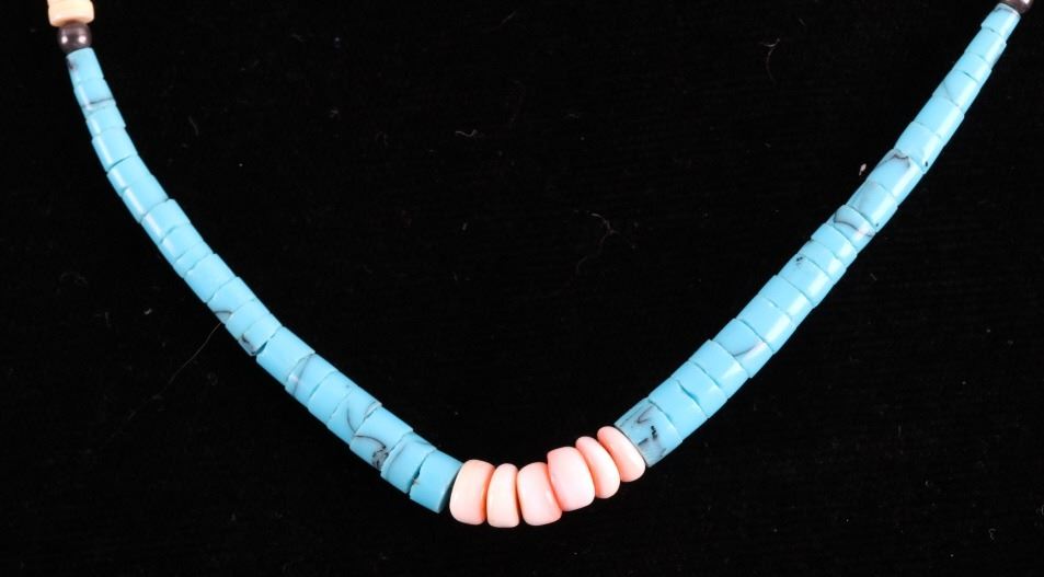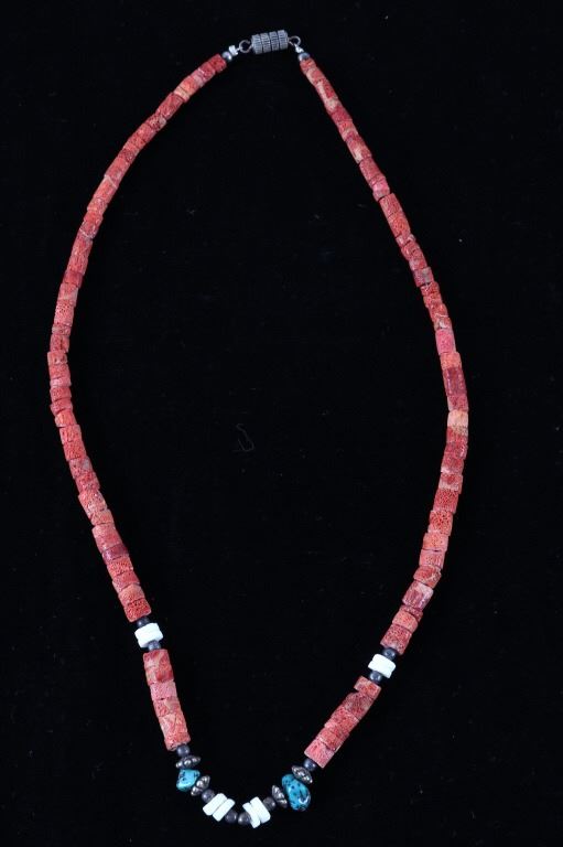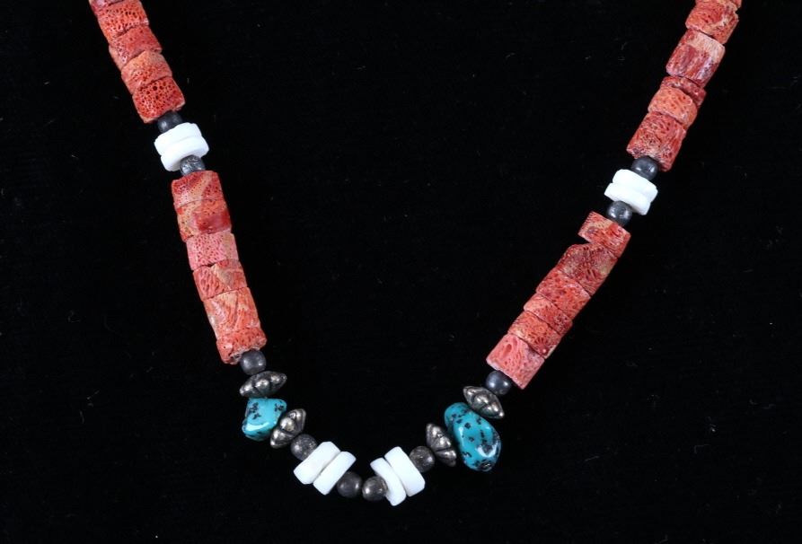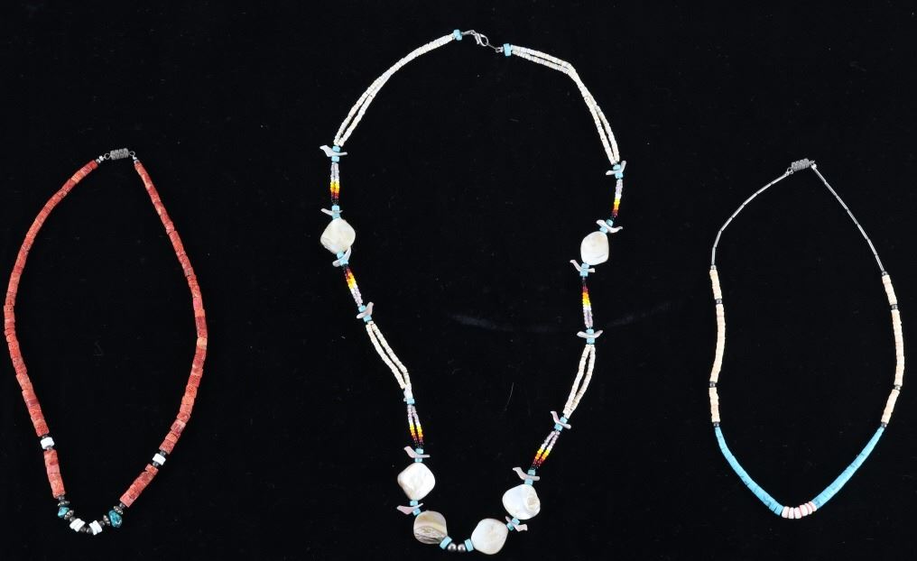 Featured in this lot is this Navajo multistone necklace collection circa 1960's. There are three necklaces in this collection. The first necklace is is constructed from Mother of Pearl, Heishi beads, and trade seed beads; that include colors of black, maroon, orange, yellow, and chalk white. The second necklace is constructed from Cripple Creek turquoise, Mother of pearl, and Heishi beads. The last necklace is constructed from red branch coral, and nugget Kingman turquoise, with discoidal shell beads. The condition of this collection of necklaces is good with no obvious signs of damage and shows good overall condition. The measurements from clasp to clasp for these necklaces is 26 3/4", 18", and 19".