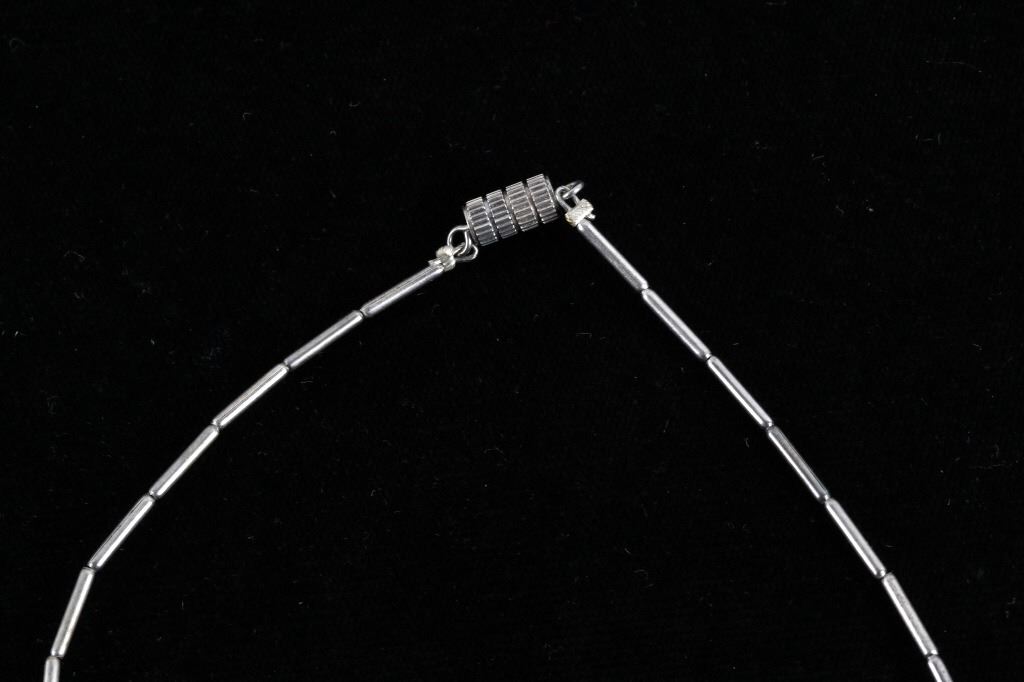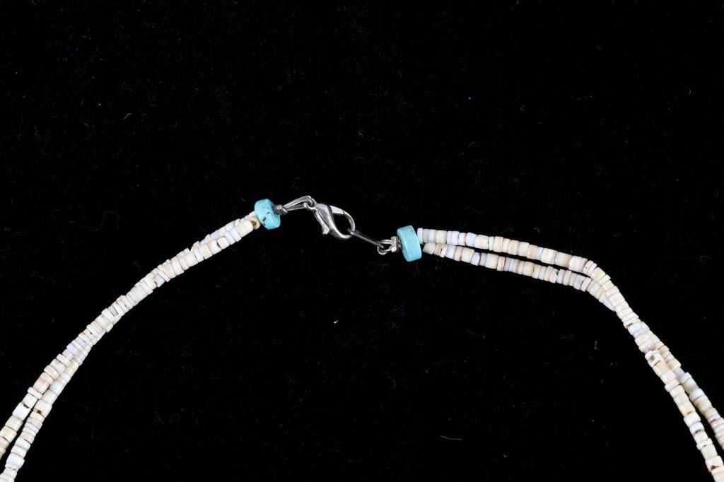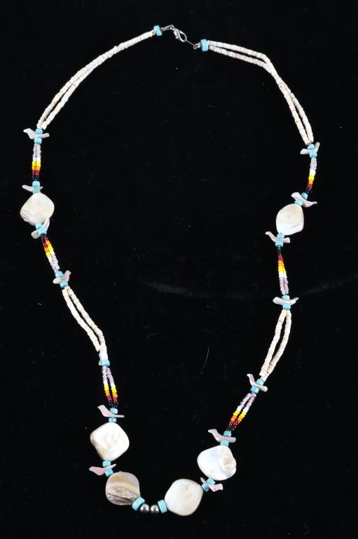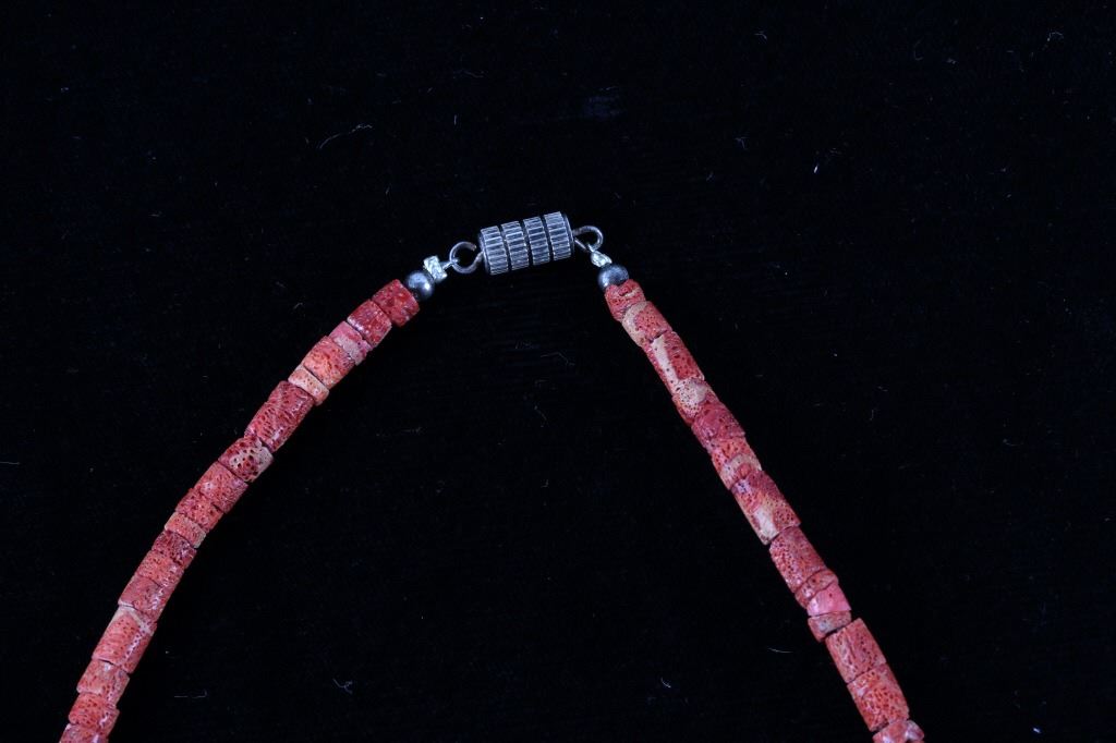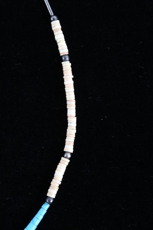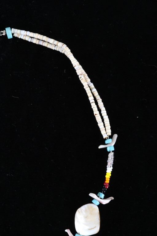 Featured in this lot is this Navajo multistone necklace collection circa 1960's. There are three necklaces in this collection. The first necklace is is constructed from Mother of Pearl, Heishi beads, and trade seed beads; that include colors of black, maroon, orange, yellow, and chalk white. The second necklace is constructed from Cripple Creek turquoise, Mother of pearl, and Heishi beads. The last necklace is constructed from red branch coral, and nugget Kingman turquoise, with discoidal shell beads. The condition of this collection of necklaces is good with no obvious signs of damage and shows good overall condition. The measurements from clasp to clasp for these necklaces is 26 3/4", 18", and 19".