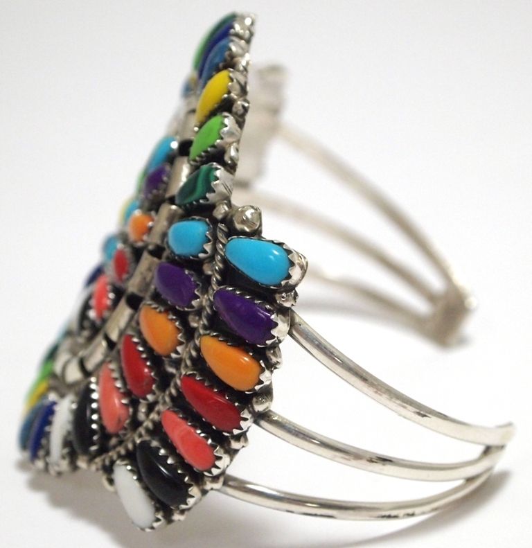 Measures 5-1/4" around with a 1-1/2" gap, 2-1/4" wide. Stones present: Coral, Turquoise, Black Jet, Sugilite, Malachite, Lapis Lazuli, Denim Lapis, Spiny Oyster.