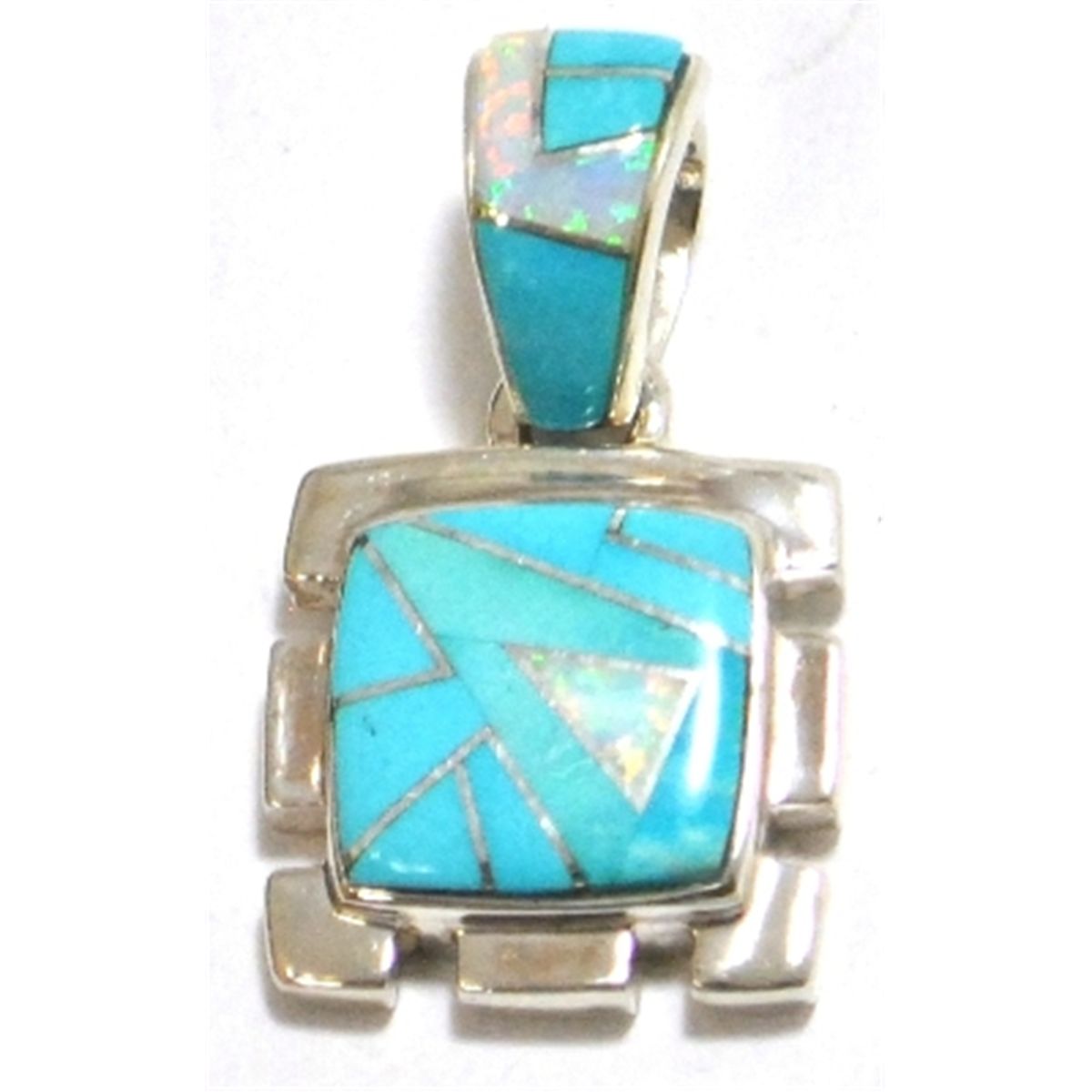 Measures 1-1/4" tall by 3/4" wide. Stones present: Turquoise, White Opal