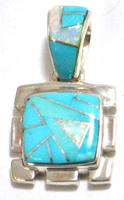 Measures 1-1/4" tall by 3/4" wide. Stones present: Turquoise, White Opal