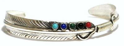 Measures 5" around with a 1-3/8" gap, 3/8" wide. Stones present: Coral, Turquoise, Black Jet, Malachite, Lapis Lazuli. Chris' pieces are exceedingly affordable; because of this the silver is thin and flexible and may have slightly sharp edges.