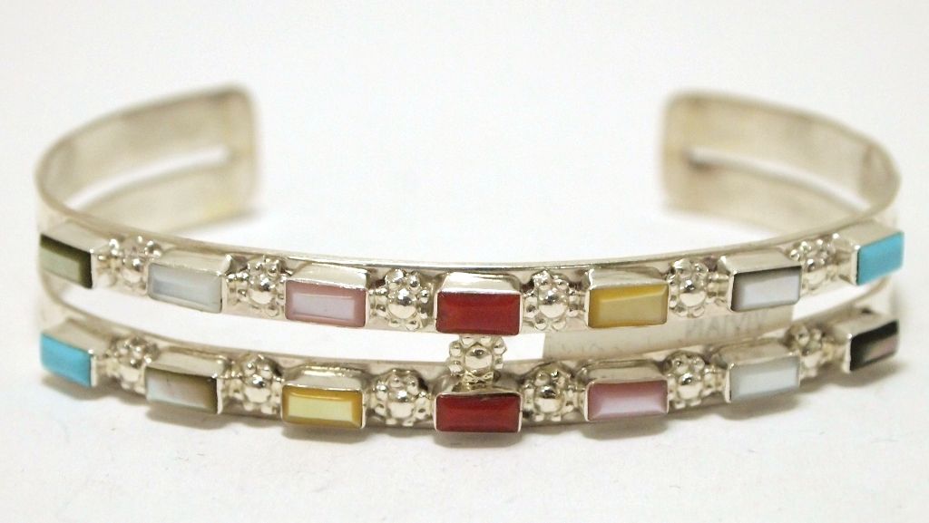 Measures 5-1/2" around with a 1-3/8" gap, 1/2" wide. Stones present: Coral, Turquoise, Various Mother of Pearl.