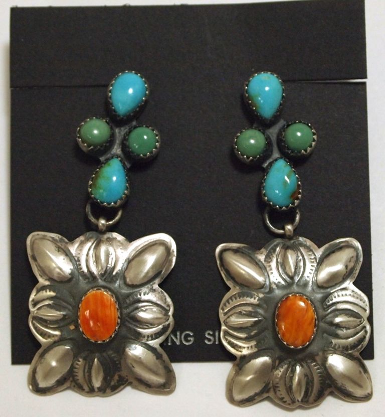 Measure 2-1/8" tall by 1" wide. Stones present: Turquoise, Green Turquoise, Orange Spiny Oyster.