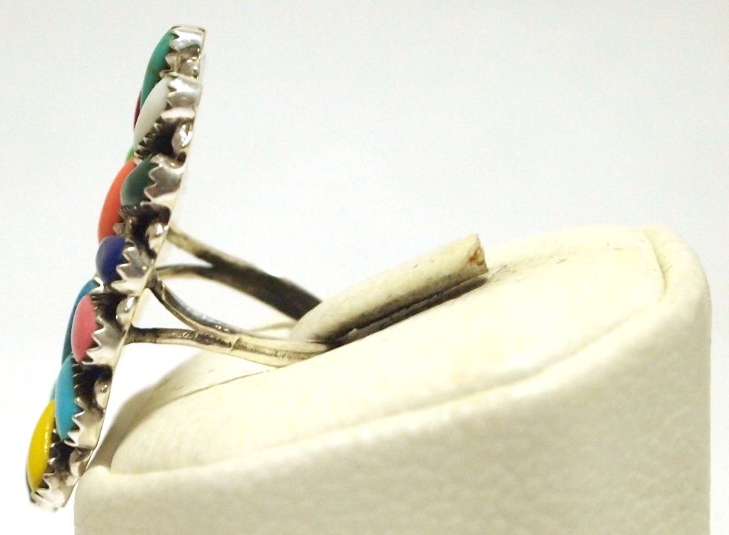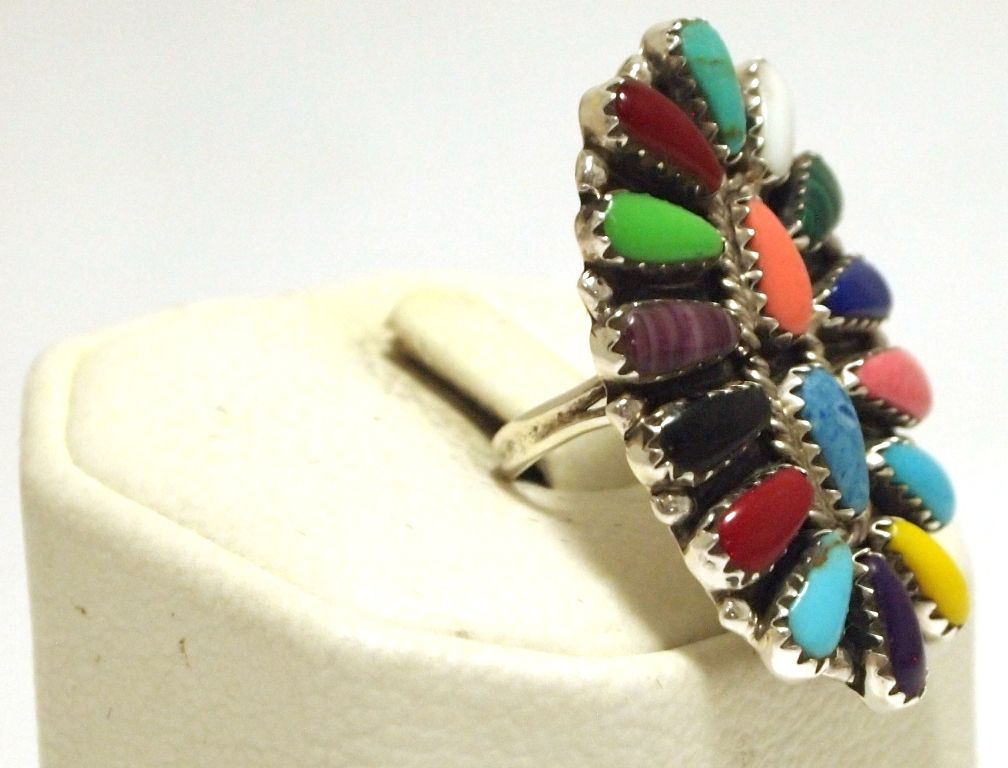 Face measures 1-1/2" tall by 1" wide/around. Band measures 1/8" wide, size: 5. Stones present: Lapis Lazuli, Coral, Turquoise, Malachite, Shell, Sugilite, Spiny Oyster.