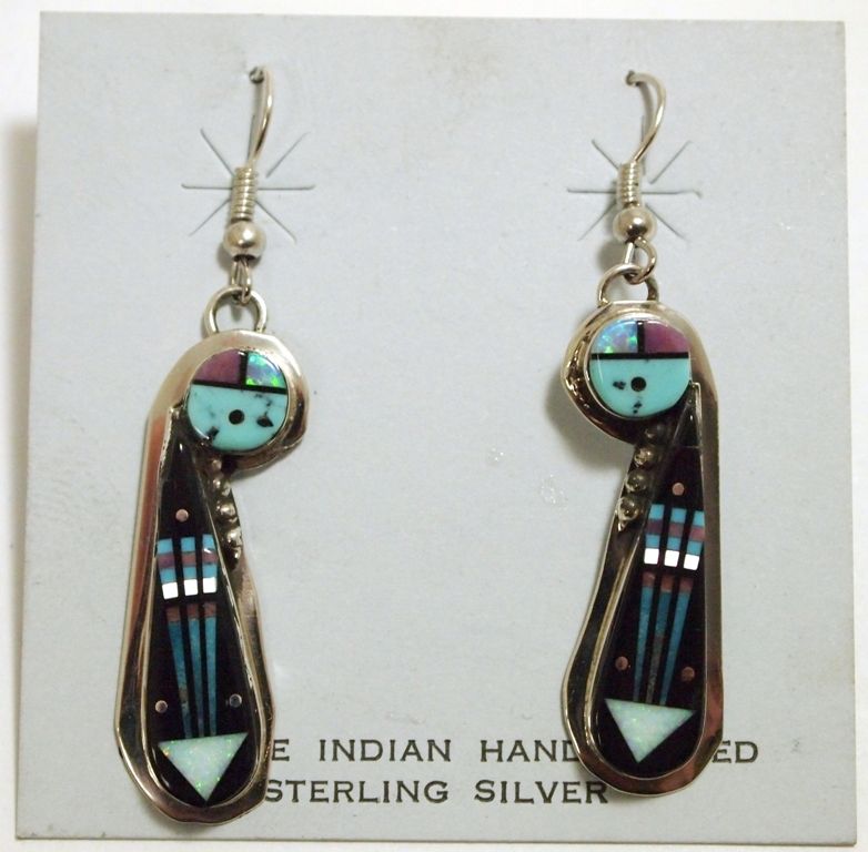 Measure 2-1/8" tall by 1/2" wide. Stones present: Black Jet, Opal, Sugilite, Turquoise.
