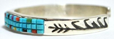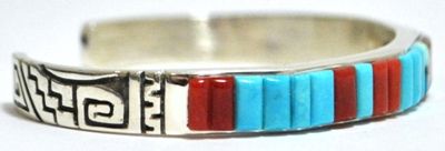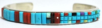 Measures 5-1/4" around with a 1" gap, 5/16" wide. Stones present: Coral, Turquoise, Opal, Malachite, Sugilite, Mother of Pearl.
