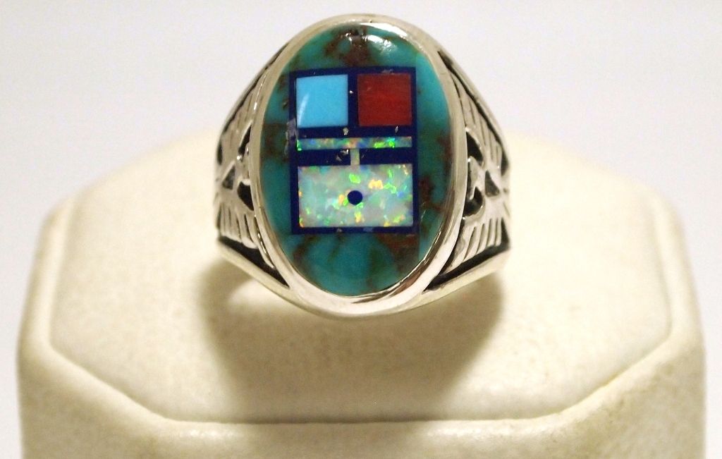 Band measures from 3/16" to 13/16" wide, size 7.75. Stones present: Coral, Turquoise, Opal, Lapis Lazuli, Spider Web Turquoise underneath sunface.