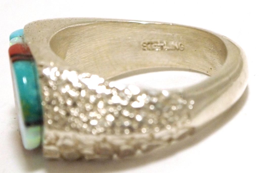 Band measures from 3/16" to 7/16" wide, size 8.25. Stones present: Coral, Turquoise, Opal, Black Jet.