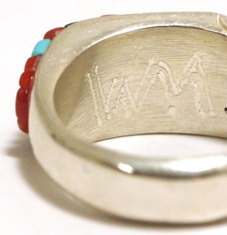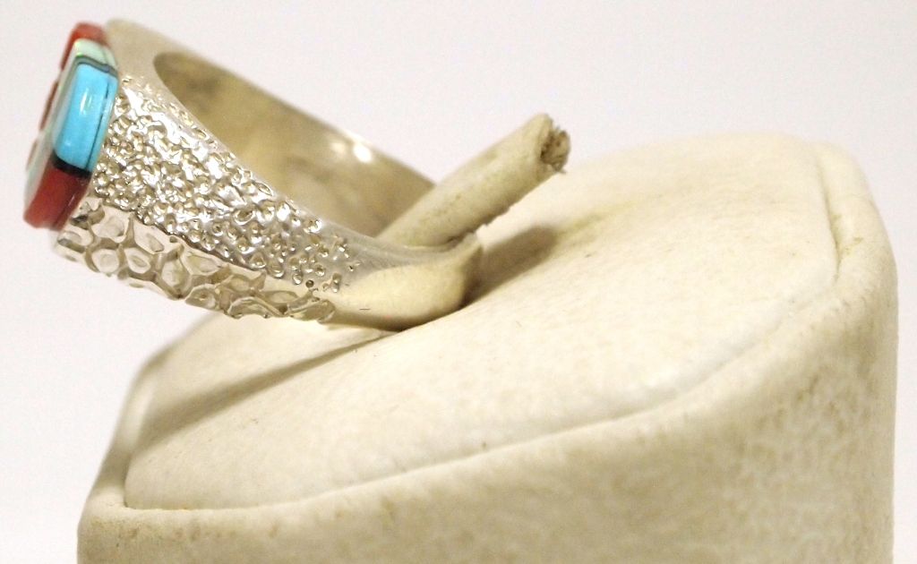 Band measures from 1/4" to 7/16" wide, size 9. Stones present: Coral, Turquoise, Opal, Black Jet, Lapis Lazuli.