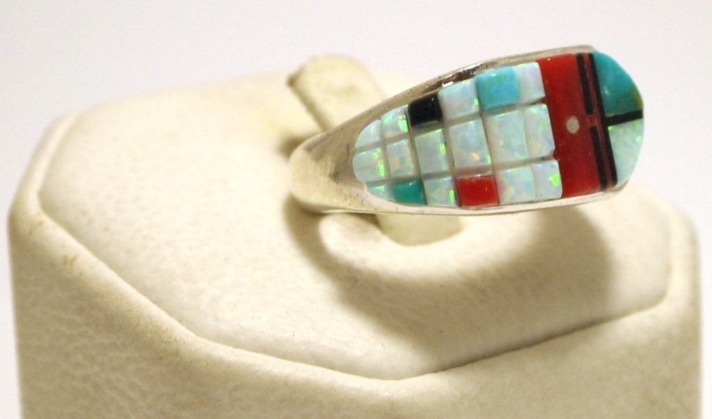 Band measures from 3/16" to 7/16" wide, size 8.25. Stones present: Coral, Turquoise, Opal, Black Jet.