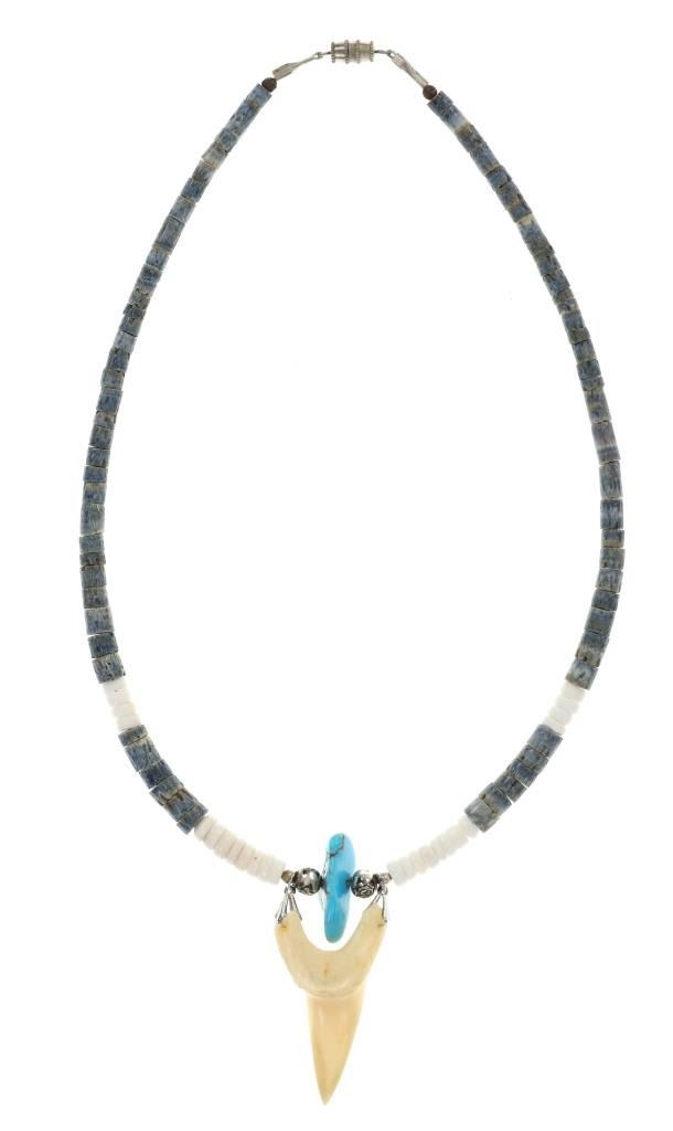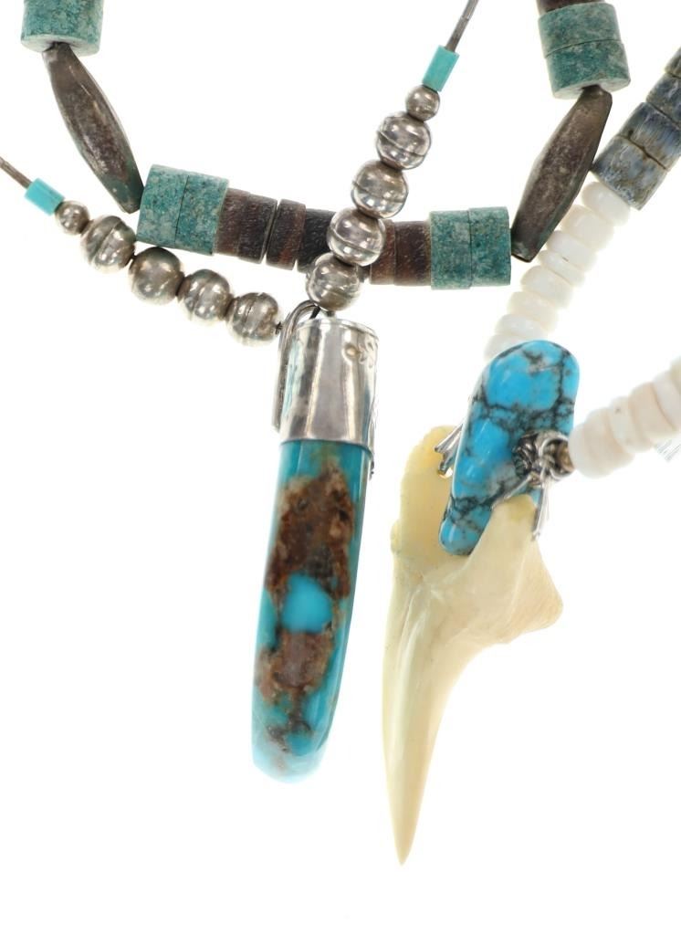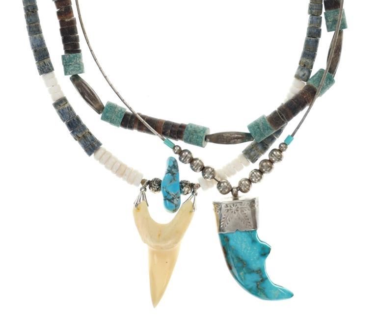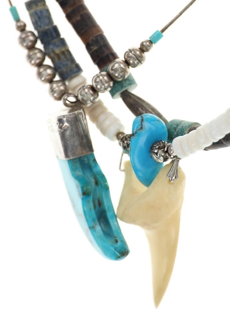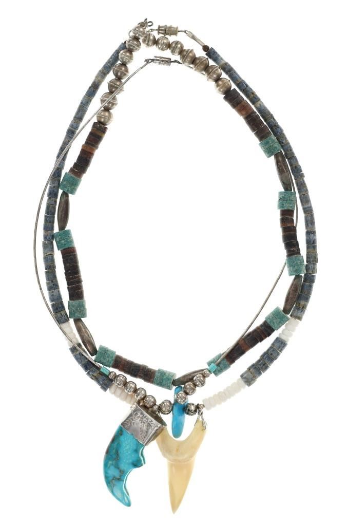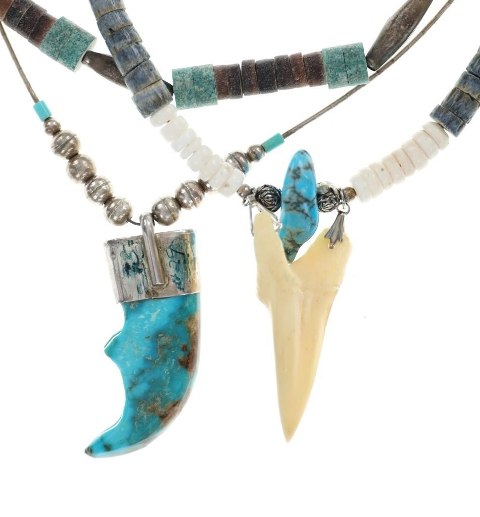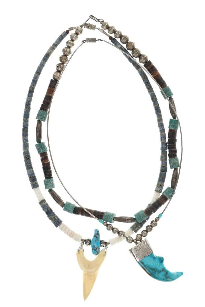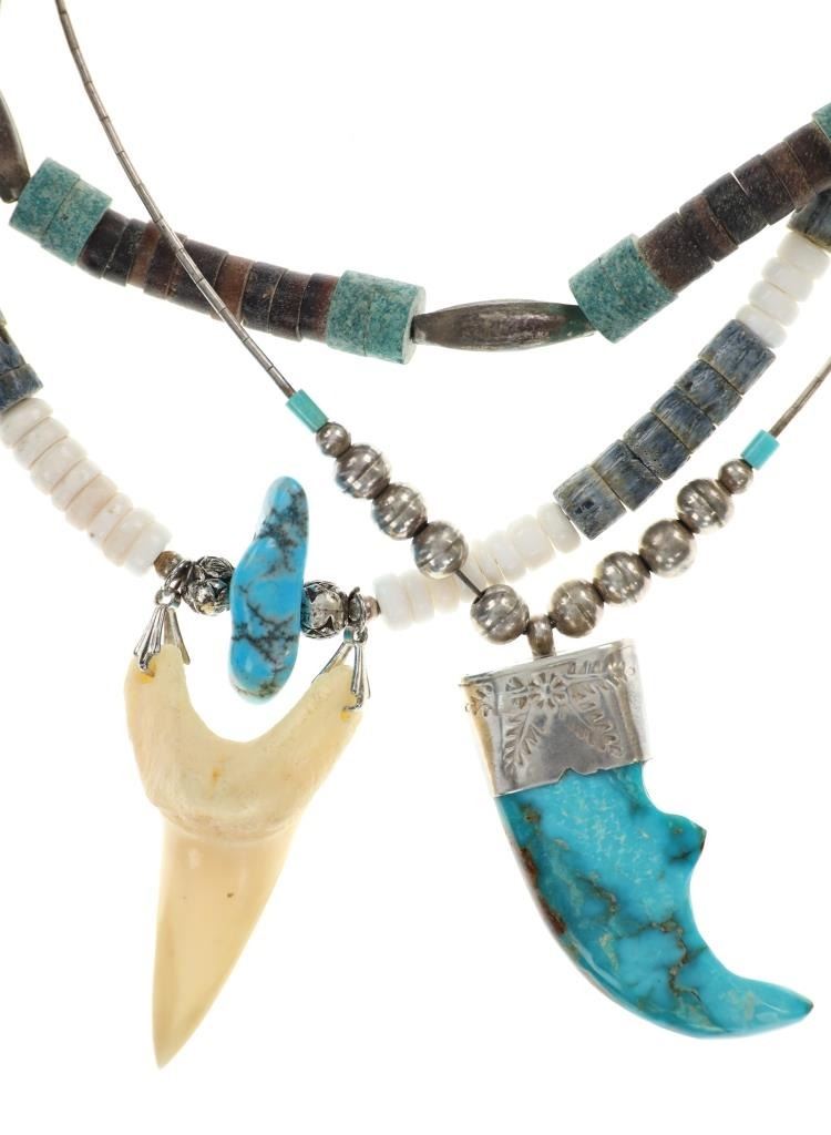 Featured in this lot is this Navajo multistone turquoise claw necklace collection. The necklaces show wonderfully and professionally crafted multistone construction. There are three necklaces in this collection. The first necklace shows a liquid silver chain with silver beads and a center pendant of Kingman turquoise carved and polished into a bear claw. The second necklace is a Navajo multistone necklace with Navajo pearls wit silver spacers. The third is a Navajo multistone necklace that shows a central nugget turquoise strung with a faux shark tooth dangling from the necklace. The condition of this necklace collection is good with no obvious signs of damage and shows good overall condition. The measurements of these necklaces from clasp to clasp range 17" to 18 1/4". The collective weight of this necklaces 74.4g