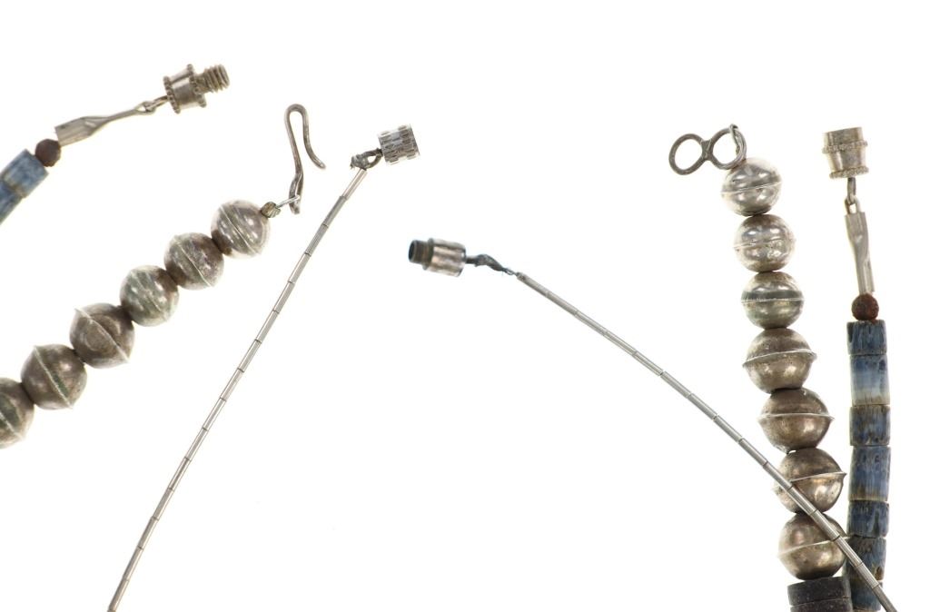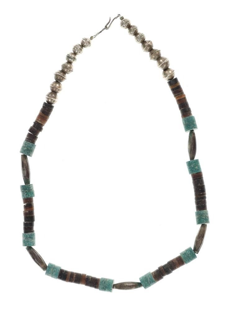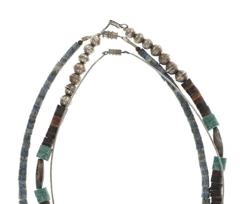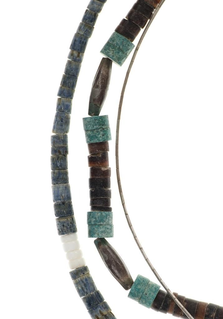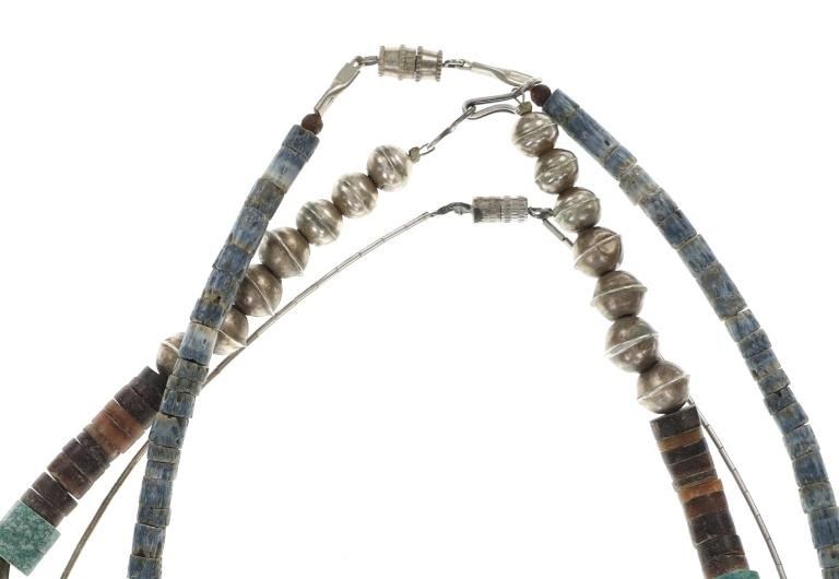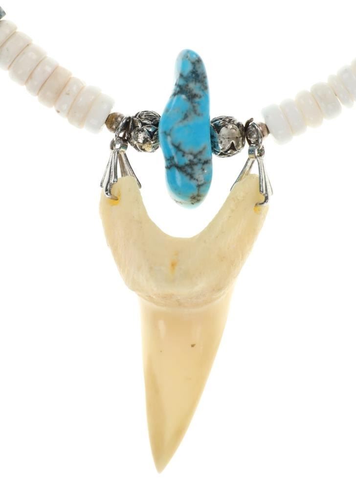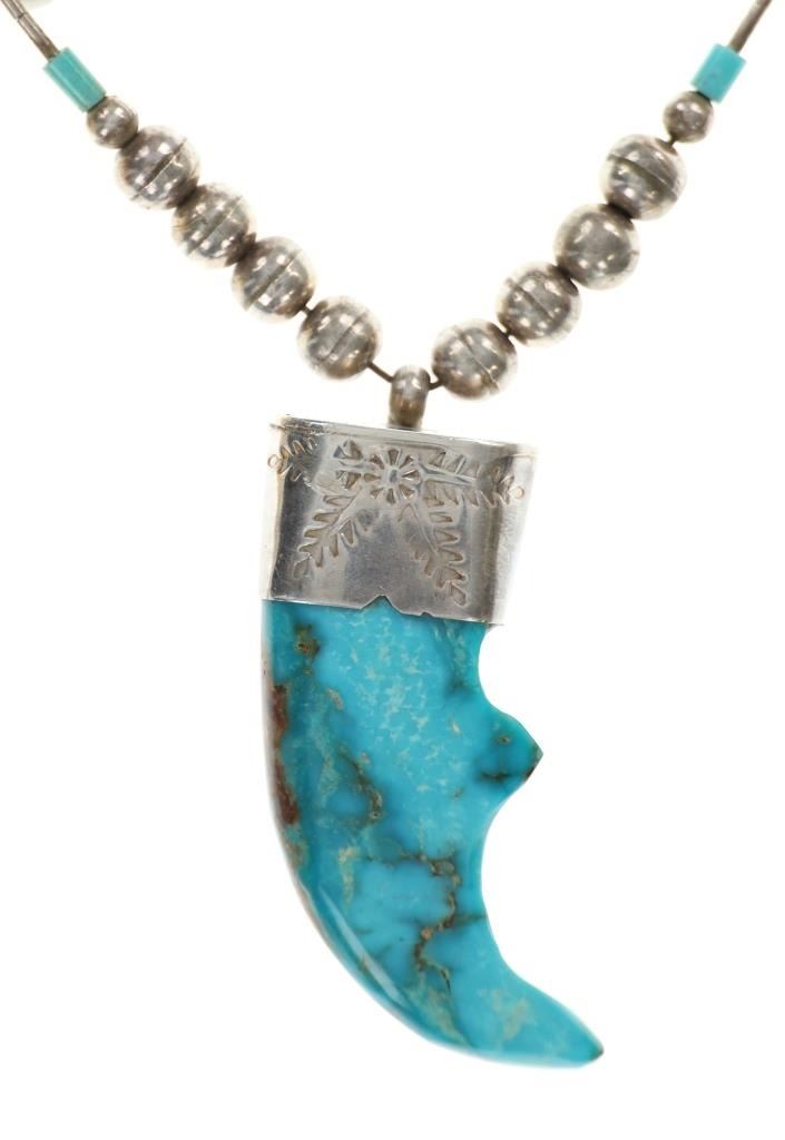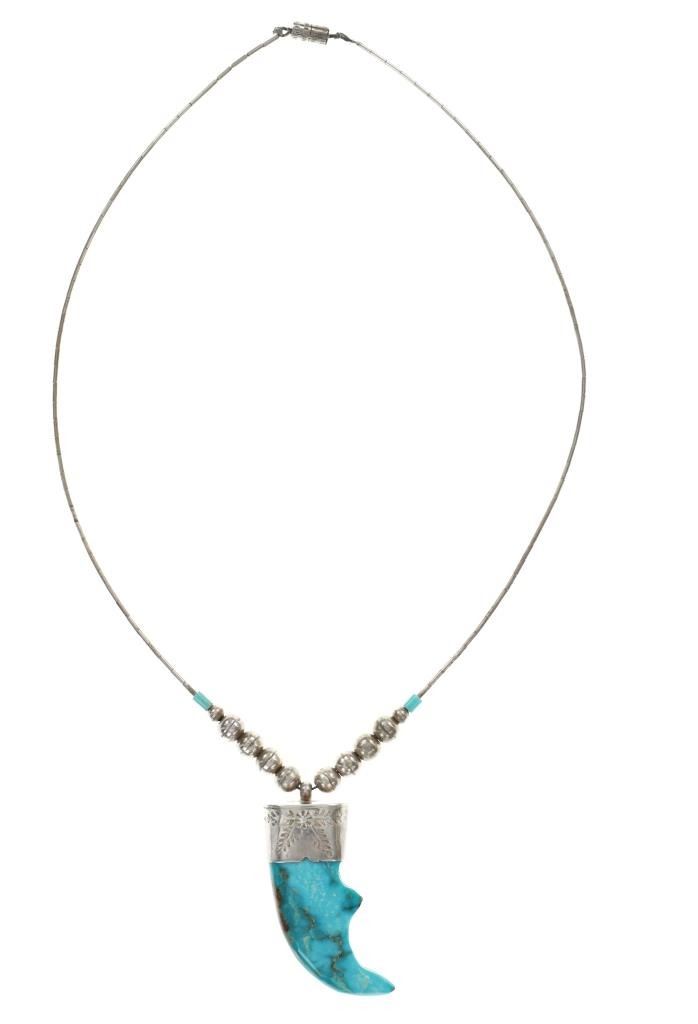 Featured in this lot is this Navajo multistone turquoise claw necklace collection. The necklaces show wonderfully and professionally crafted multistone construction. There are three necklaces in this collection. The first necklace shows a liquid silver chain with silver beads and a center pendant of Kingman turquoise carved and polished into a bear claw. The second necklace is a Navajo multistone necklace with Navajo pearls wit silver spacers. The third is a Navajo multistone necklace that shows a central nugget turquoise strung with a faux shark tooth dangling from the necklace. The condition of this necklace collection is good with no obvious signs of damage and shows good overall condition. The measurements of these necklaces from clasp to clasp range 17" to 18 1/4". The collective weight of this necklaces 74.4g