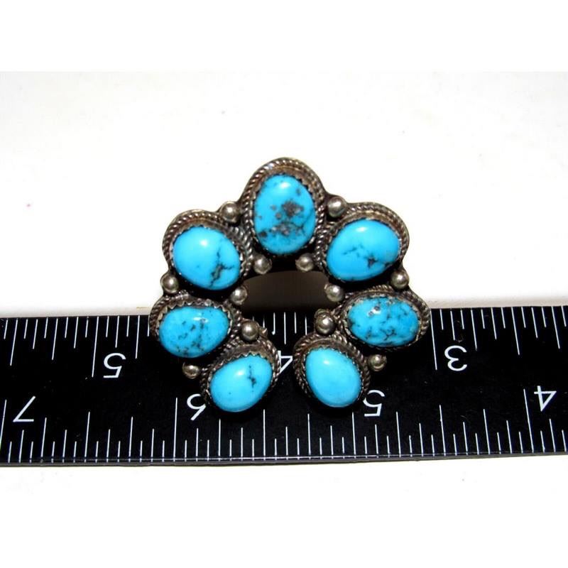 For your consideration is this stunning Navajo sterling silver, Kingman turquoise squash blossom naja design ring in size 9. Measures about 1.5" by 1.5" on the front. Signed by the artist, stamped sterling. Stone matrix varies from ring to ring, but all similar natural Kingman. Stunning example of wearable Native American art to add to any jewelry collection! FREE SHIPPING ON ALL JEWELRY ORDERS WITHIN THE US!