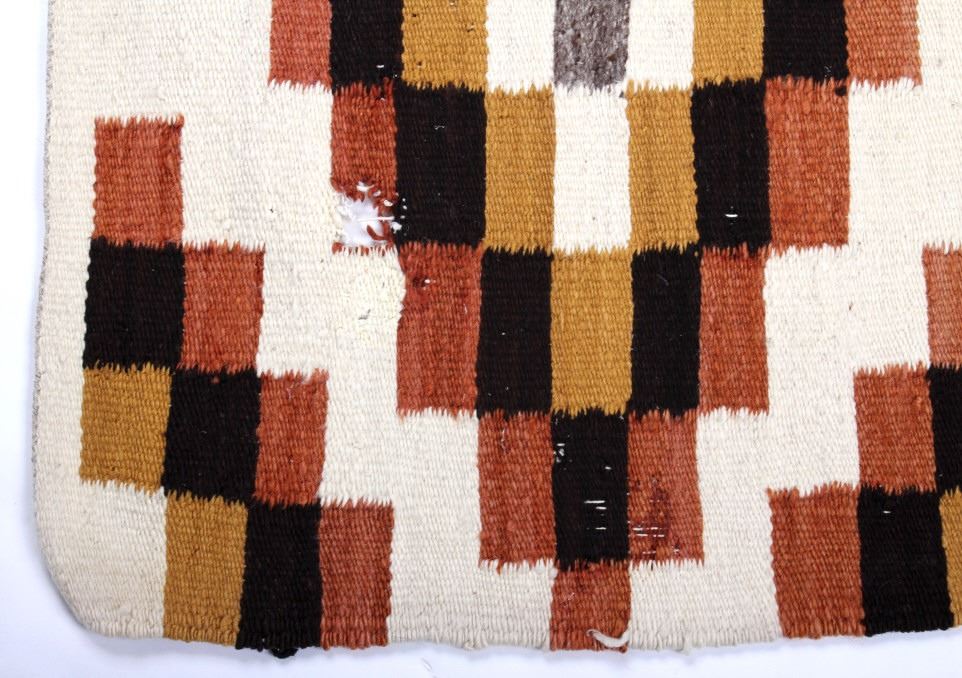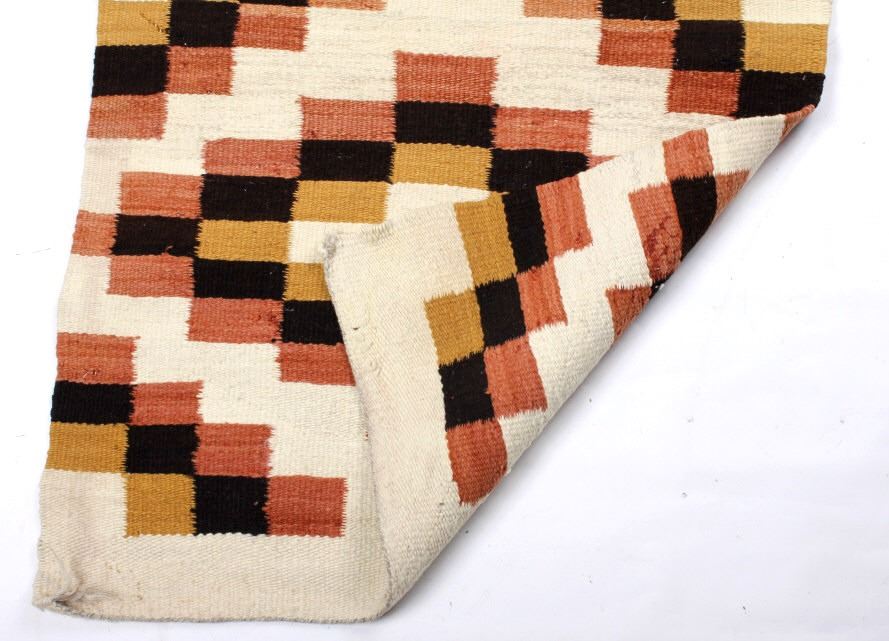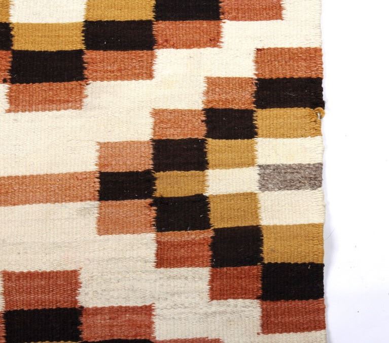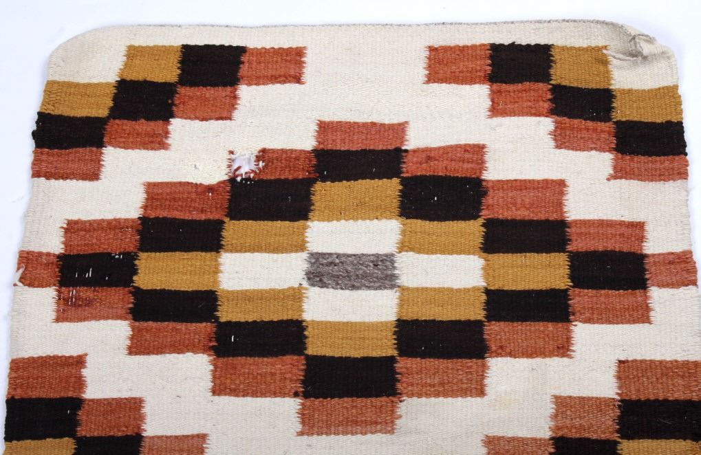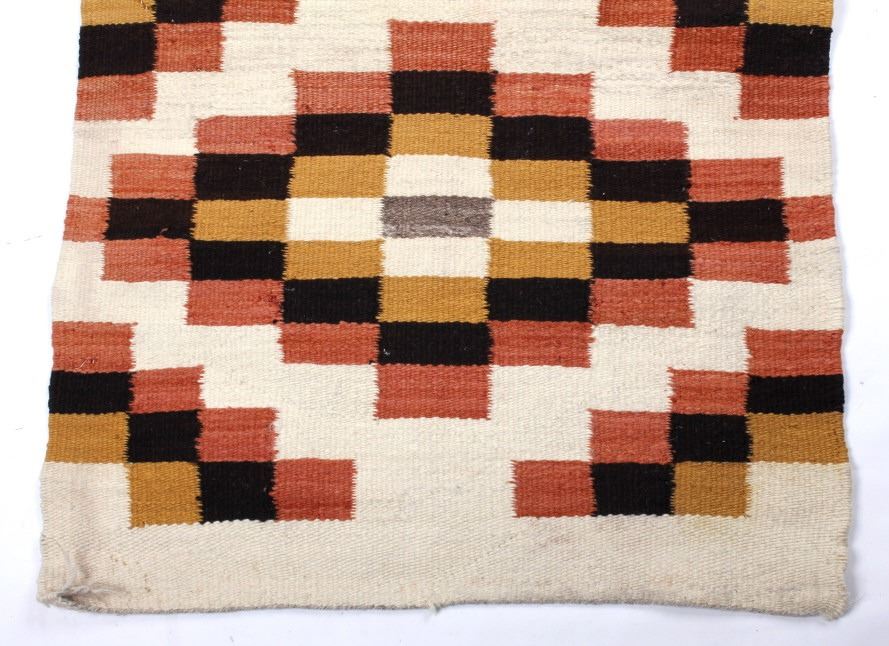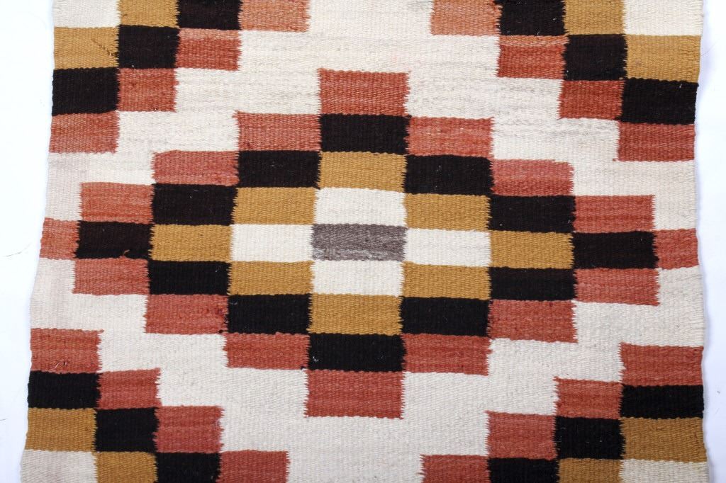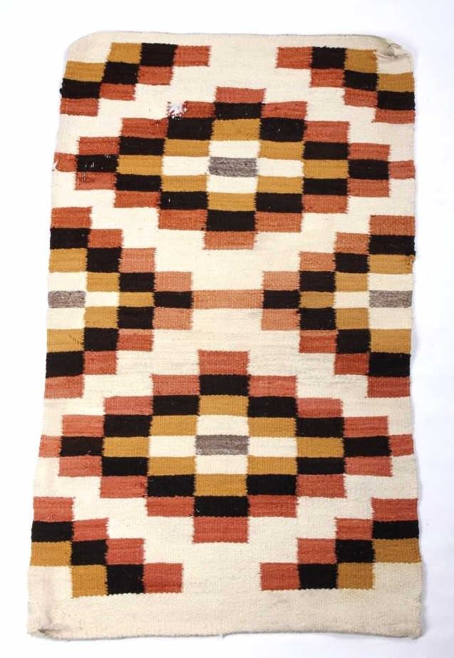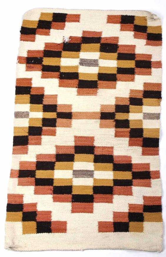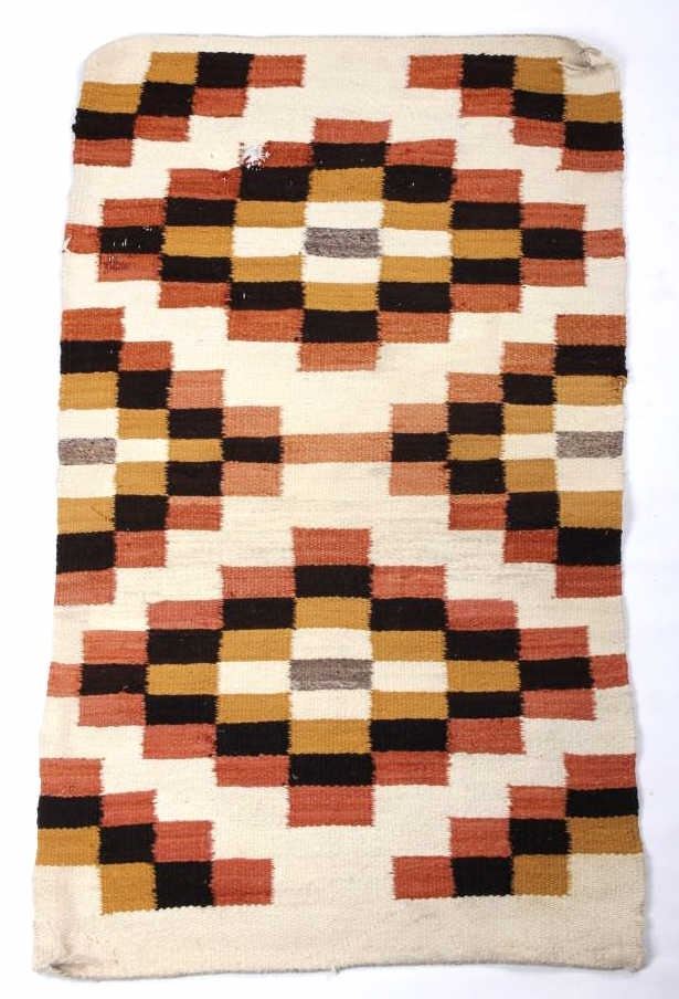 Included in this lot we have a Navajo Native American Crystal rug. The rug is made of dyed wool showing mustard yellow, brown, rust red, and white. The rug shows good patterning with a number of crystal like shapes. The piece is in good condition overall with one spot of wear in the rug. It measures 43 1/2" long by 24 1/2" wide.