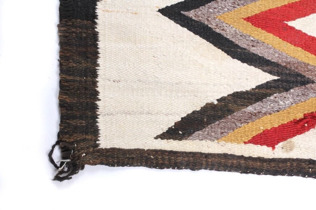 For your consideration is this wonderful hand woven Crystal Pattern wool rug. The rug features red, goldenrod, gray and dark brown zig-zigs on a white field with a dark brown border. The zig-zags form diamond shapes down the center of the rug; in the center of each diamond shape are graduated triangles pointed inward. The rug is in good condition with a tight weave, but some fraying along the sides. The measurements of this rug are 42" x 40".