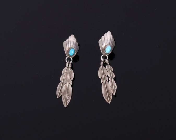 Offered in this lot for your bidding pleasure is this pair of beautiful Navajo Native American Silver and Sleeping Beauty Turquoise Earrings. These beautiful earrings display a silver construction with two detailed silver feathers dangling from each earring. The polished Sleeping Beauty Turquoise stone is firmly set on the earring. These earrings show excellent condition and measure 2 1/4" long.