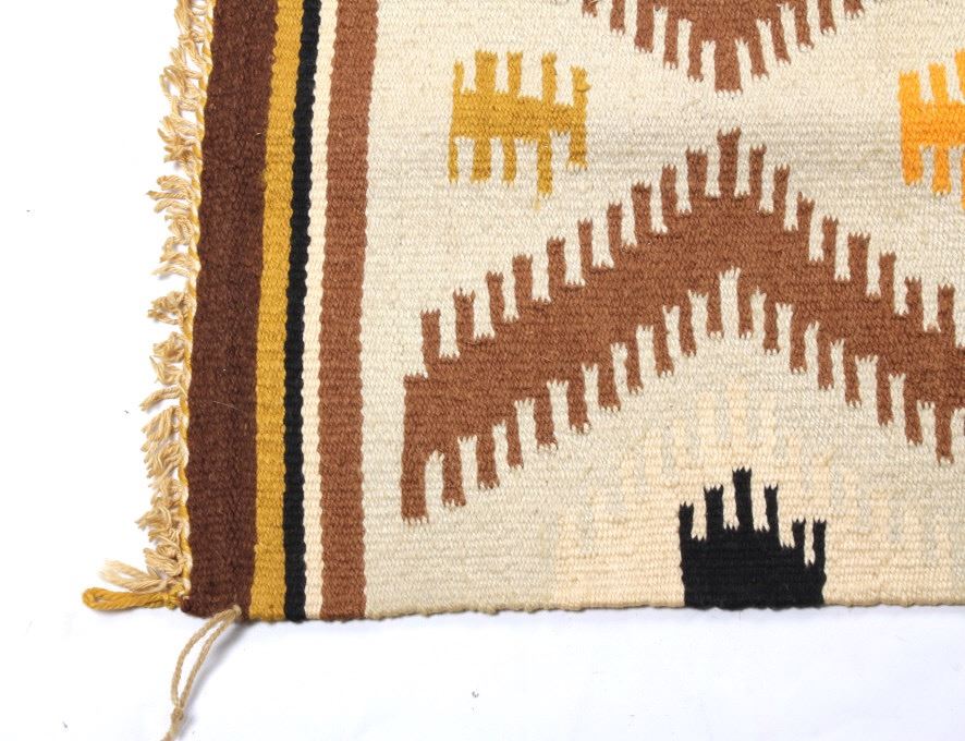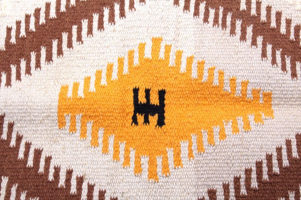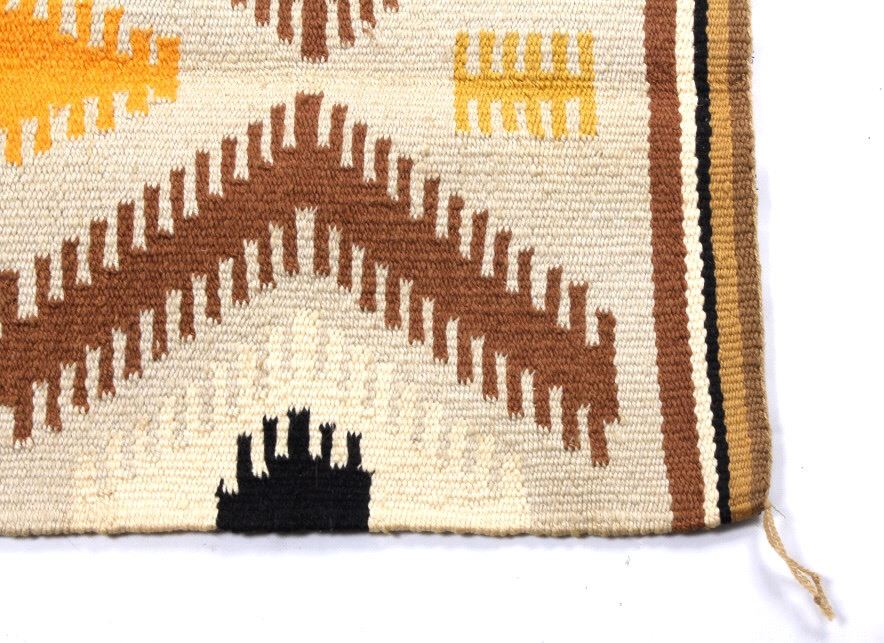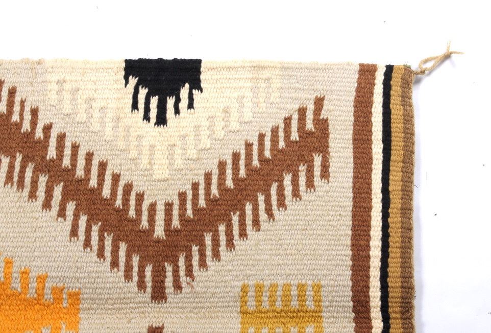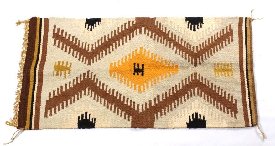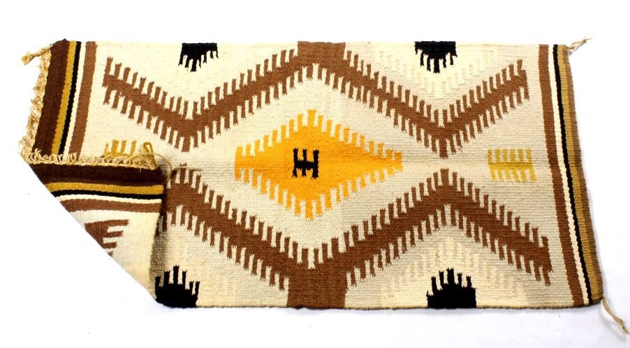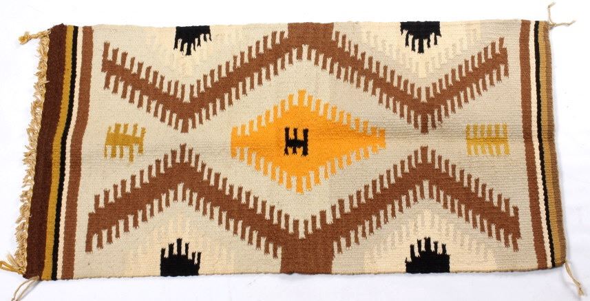 For your consideration is this small Native American Navajo Chinle pattern rug. The rug features an orange Chinle star in the middle on a grey field with two bands of brown on either side of the rug. In addition to grey, orange, and brown, the rug also shows small accents of yellow and black. The rug is in good condition with tight weaving. The front side of the rug shows some fading from sun. It measures 36 1/2" X 19 1/4".