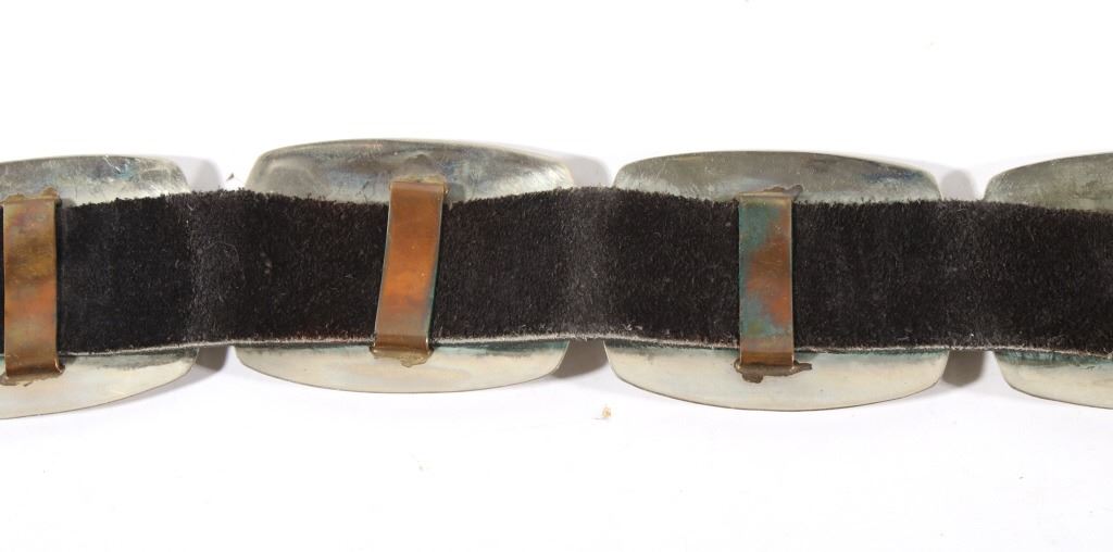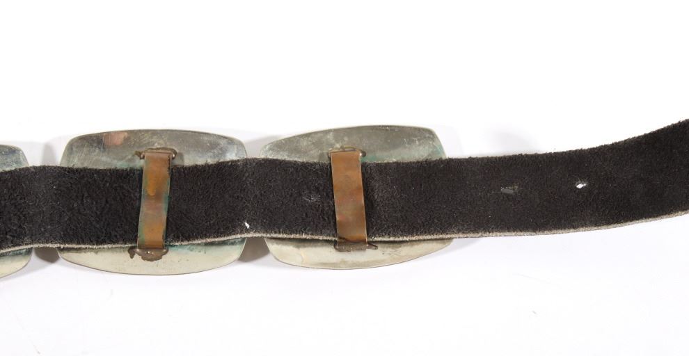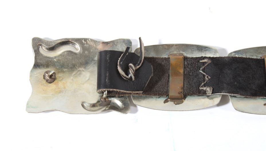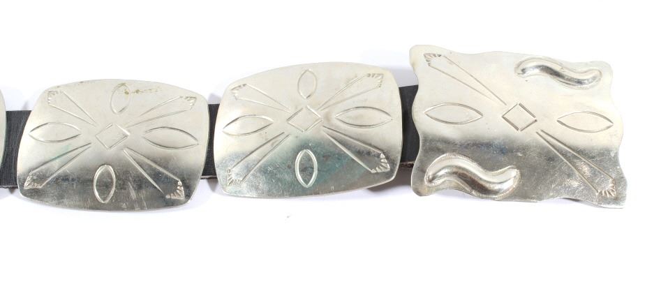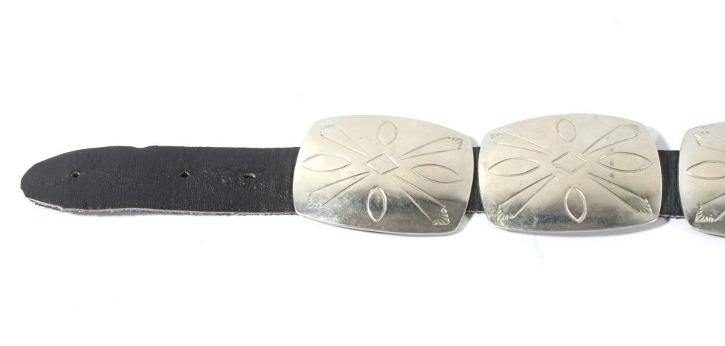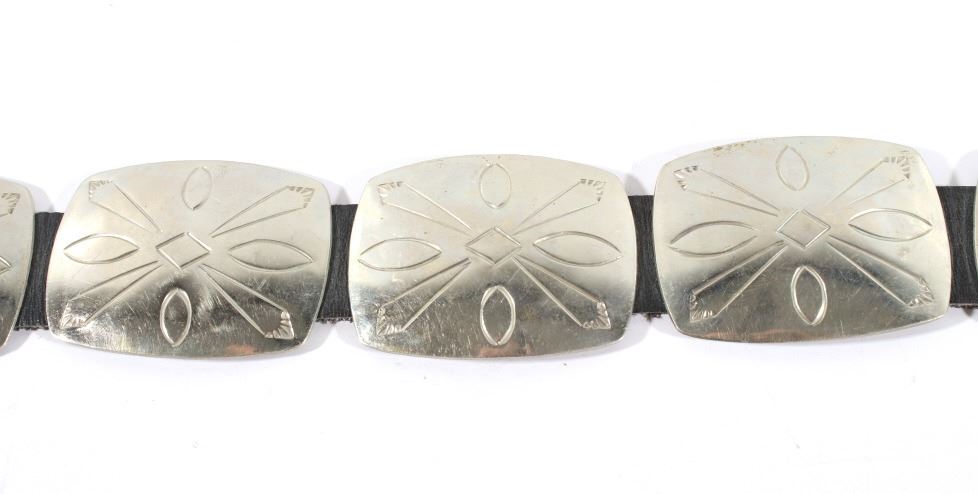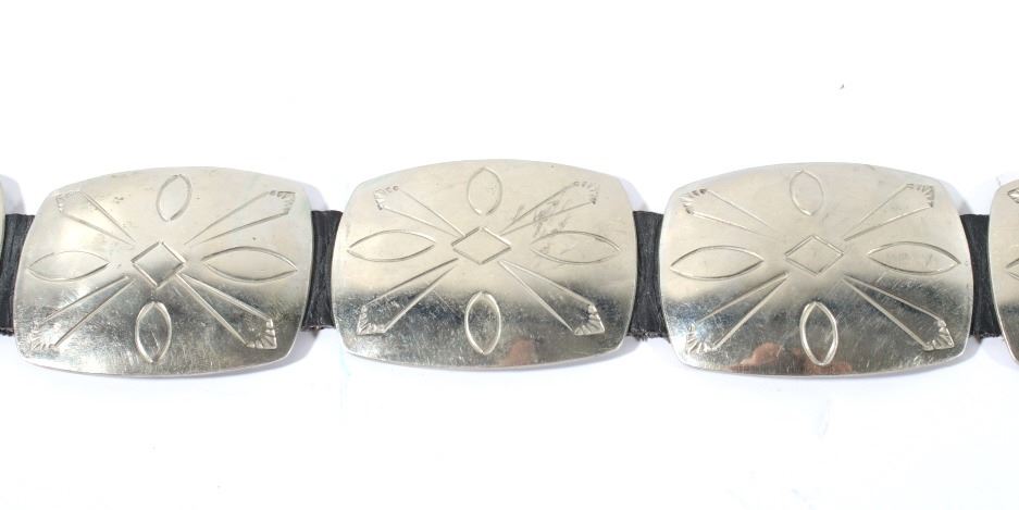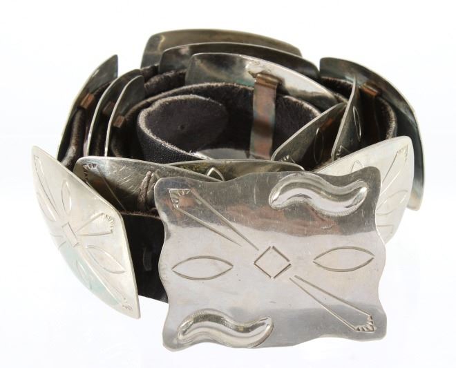 Included in this lot we have a Navajo Native American sterling silver concho belt. The belt features thirteen solid sterling silver conchos and a silver belt buckle. The conchos display a pressed geometric patterns repeated across each concho. The belt buckle shows some pressed geometric patterns with two embossed designs in the top right and bottom left corners. The conchos are attached to a black leather belt and is free of signatures and hall marks. The piece weights 10.48 oz and measures 37 1/4" long by 1 3/4" wide.