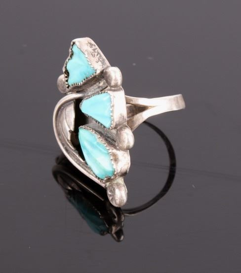 For your consideration we have two signed Navajo Native American sterling silver and turquoise rings. The rings displays sterling silver construction with silver vine and leaf patterns across the top. The face of the first ring shows two cabochons of Royston turquoise set into the top bordered with silver ornamentation. The back of this piece is marked with an "FN" artist hallmark. The face of the second ring shows 3 cabochons of Royston turquoise and silver bead and feather ornamentation. The back of this piece is marked with an "NE" artist hallmark. Both pieces show good condition overall with some spots of warm patina. The first ring is fitted for a US size 9 1/2 with the top measuring 1 1/2" long by 3/4" wide. The second ring is fitted for a US size 9 1/2" with the top measuring 1 1/2" long by 7/8" wide.