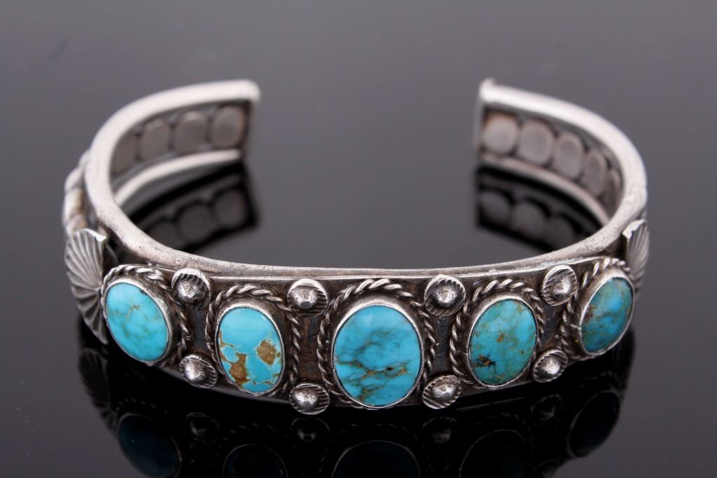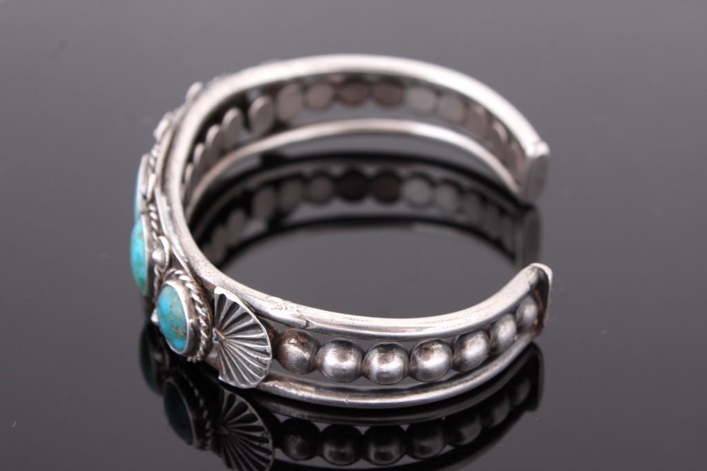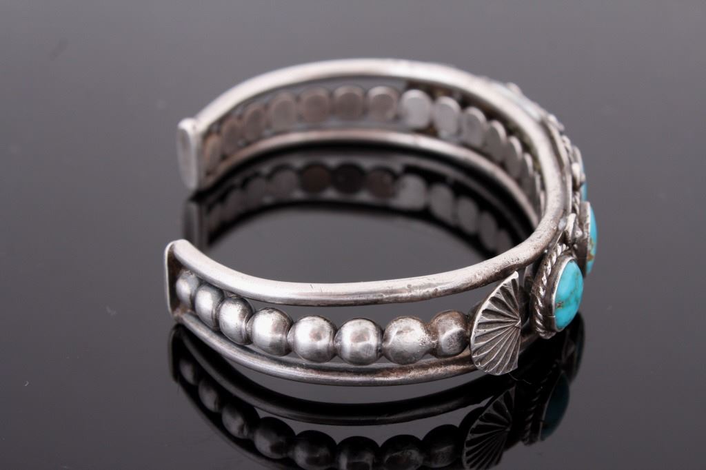Offered for your bidding pleasure is this Navajo Native American Cripple Creek Turquoise Bracelet. This bracelet shows five polished Cripple Creek Turquoise stones, accented by excellent silver detail. The stone is encompassed by a twisted rope detailing and the polished Turquoise stones are separated by eight polished silver nuggets. The sides of the bracelet show eight polished silver beads as well as a semi circle shape. This piece shows excellent condition and measures 5 1/4". This piece weighs 1.36 ozt.