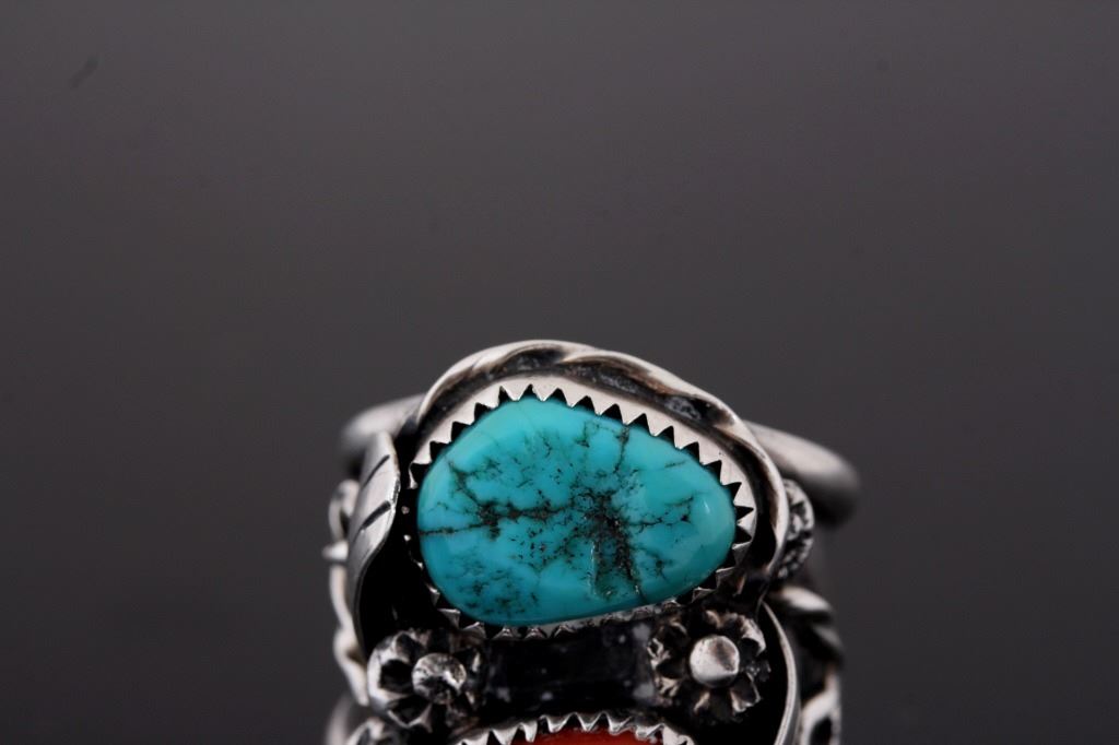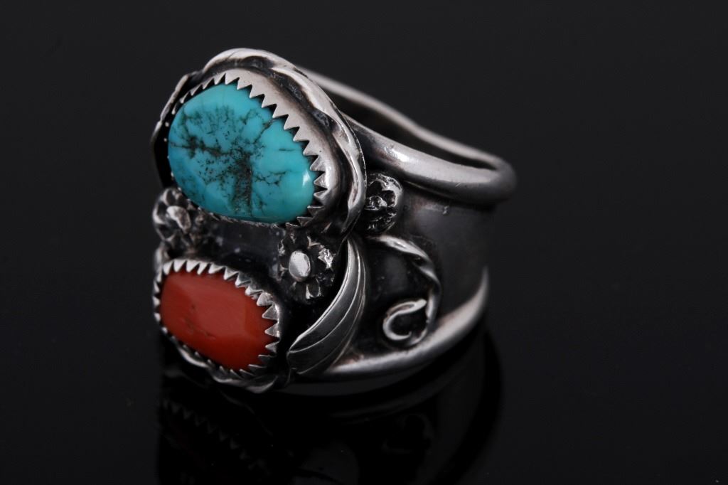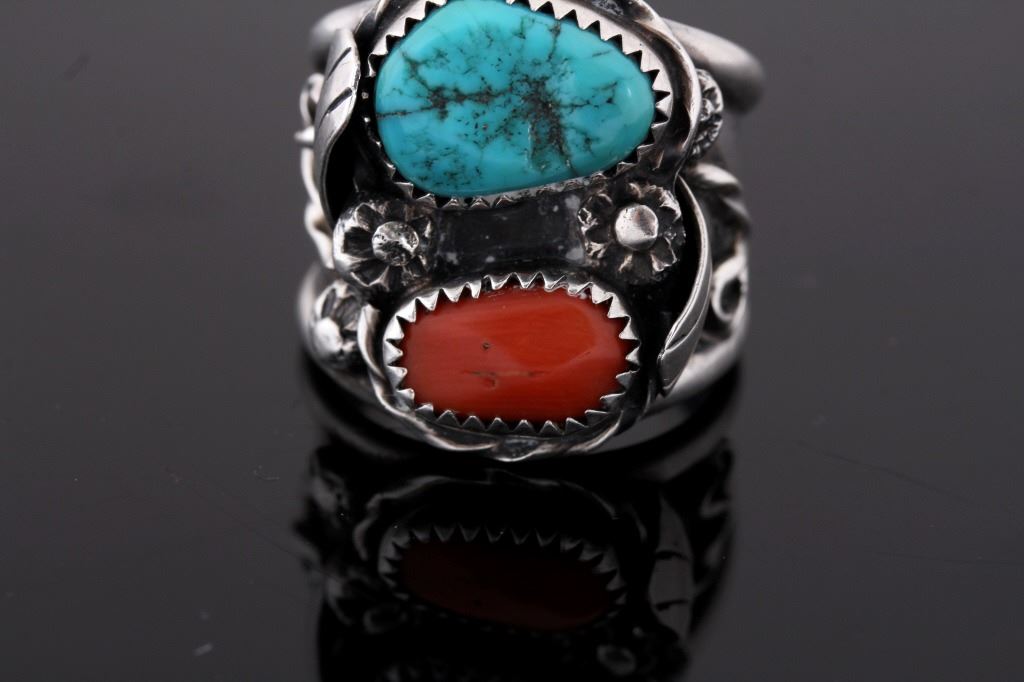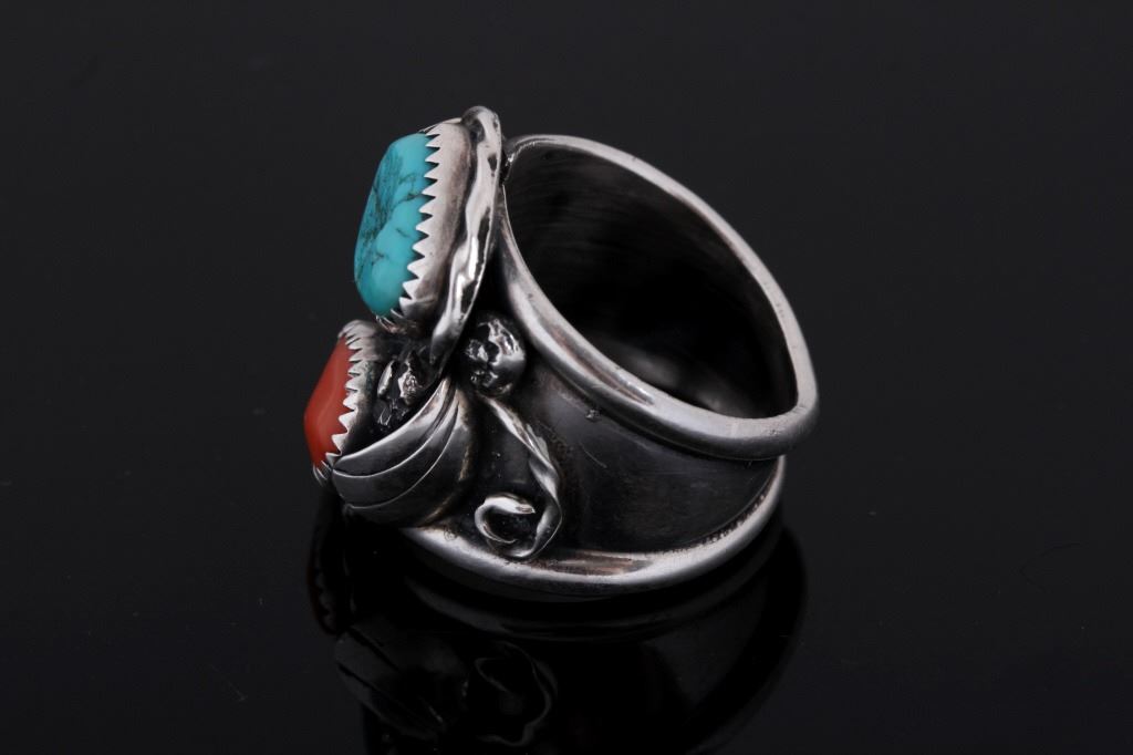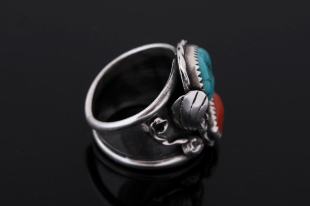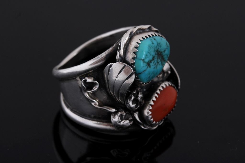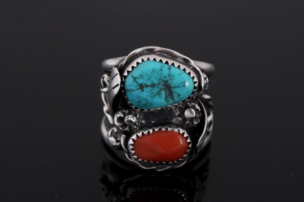 Available for your bidding pleasure is this Navajo Native American Turquoise & Coral Ring. This ring shows a Silver construction with a Morenci Turquoise and Red Branch Coral polished stone set firmly into the silver. The ring shows silver floral detailing as well as two polished silver nuggets. This piece shows excellent condition and quality and measures US 9 1/2. This piece weighs .41 ozt.