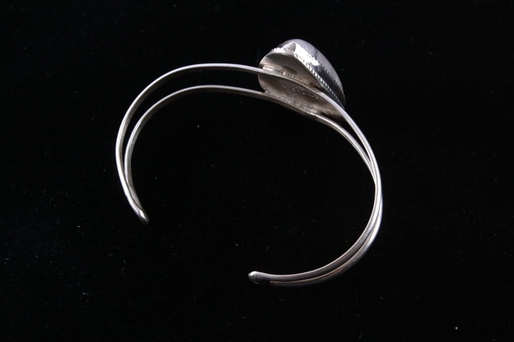 This is an original Navajo Jerome Begay sterling silver bracelet set with a natural Tourmalinated Quartz stone. The piece is signed "JB Sterling" and shows a double strand of sterling silver with a tear drop large polished cabochon of tourmalinated quartz or rutilated quartz which shows a clear field with straigh black matrix lines. Good condition. Measures 7.5"L inside circumference wrist size which includes the 1 5/8"W opening.