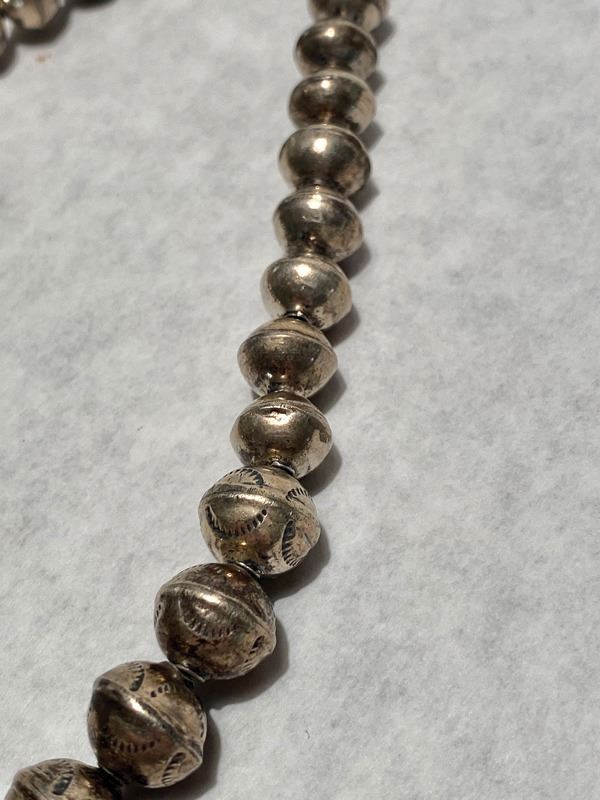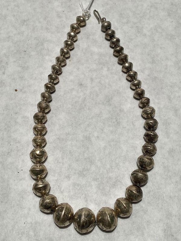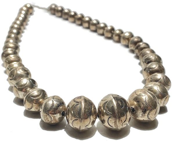 Late 1900s 24" Beautiful strand of handwrought, graduated, stamped silver beads. Very good condition.