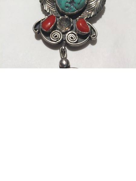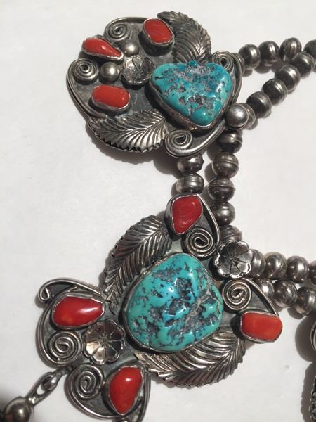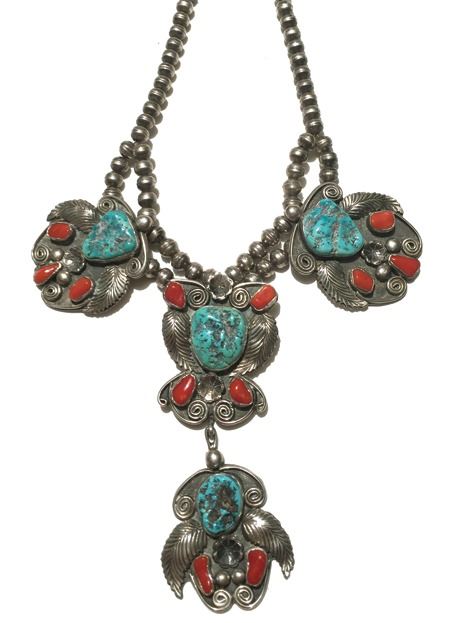Late 1900s, Fabulous sterling bead necklace with three attached sterling leaf and scroll ornaments set with turquoise and coral cabochons, plus an additional drop pendant hanging from the center ornament; hallmarked. 16" + 4-1/2" drop