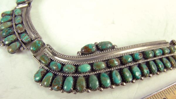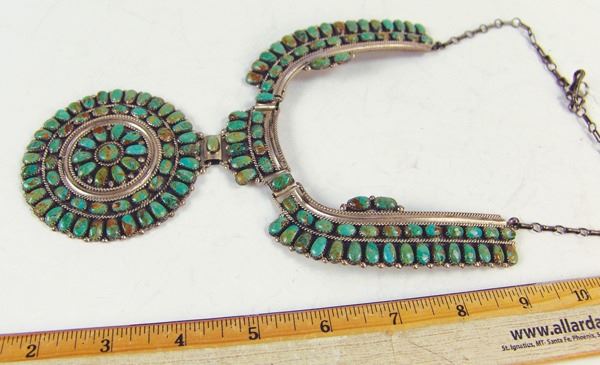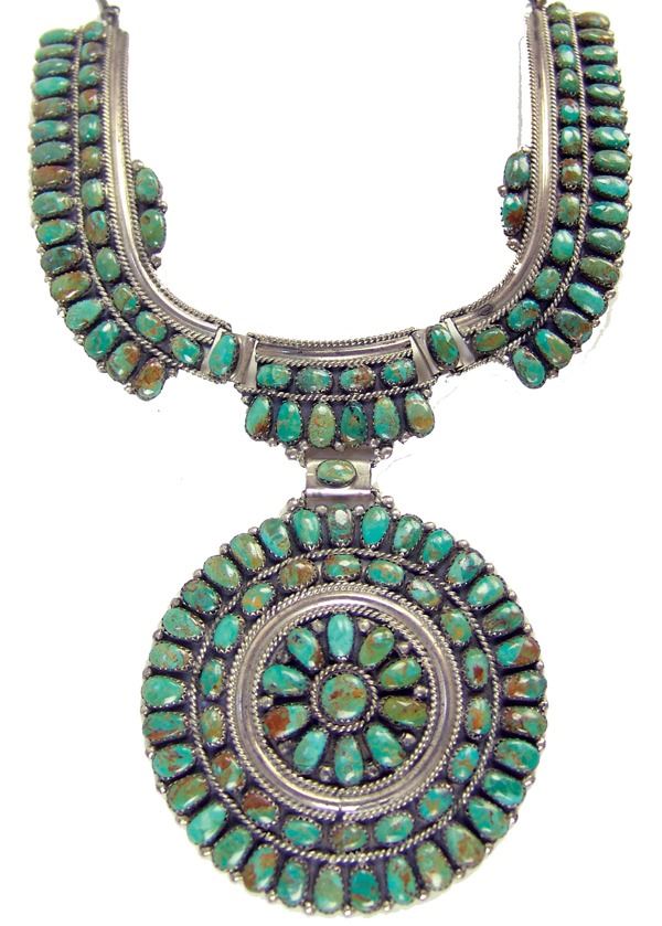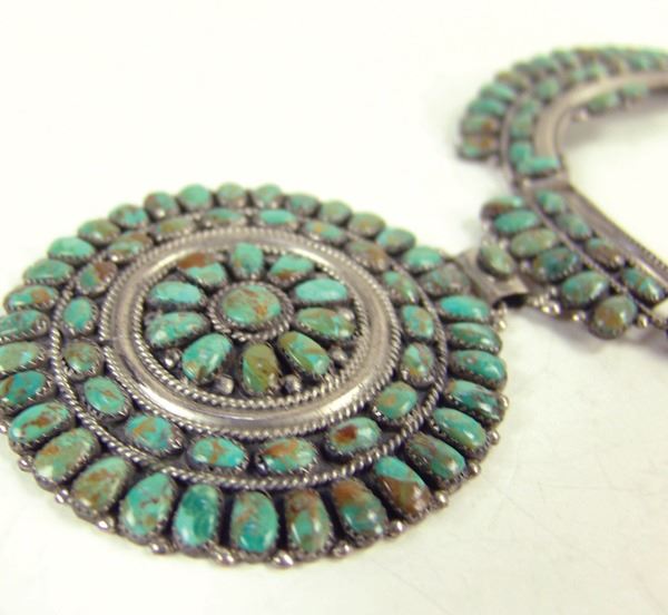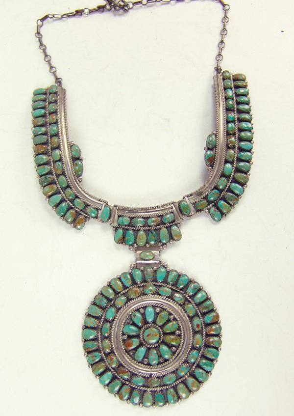 Beautiful, cluster design, all silver necklace set with 135 individually hand cut and set, green turquoise stones with brown matrix. Very good condition.Ca. 1980s21" + 3" pendant