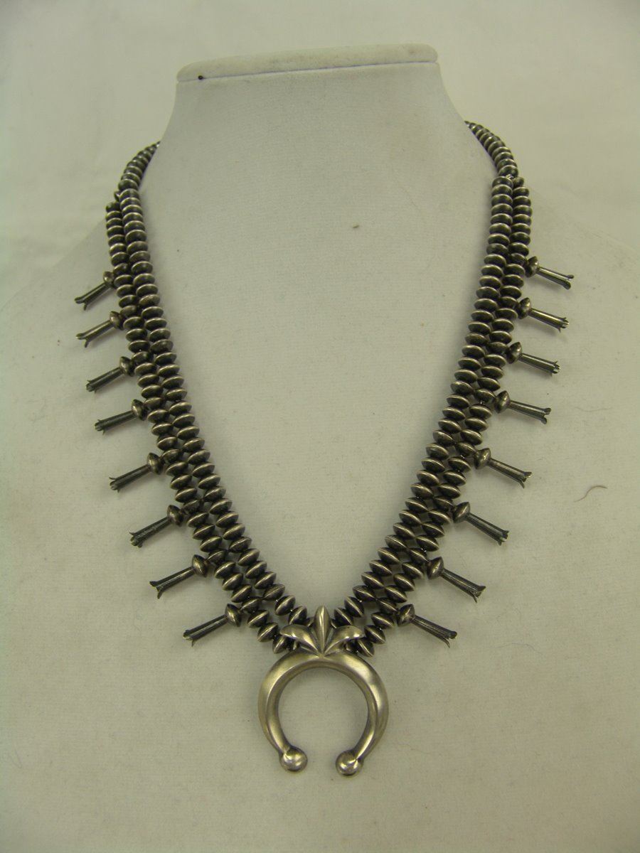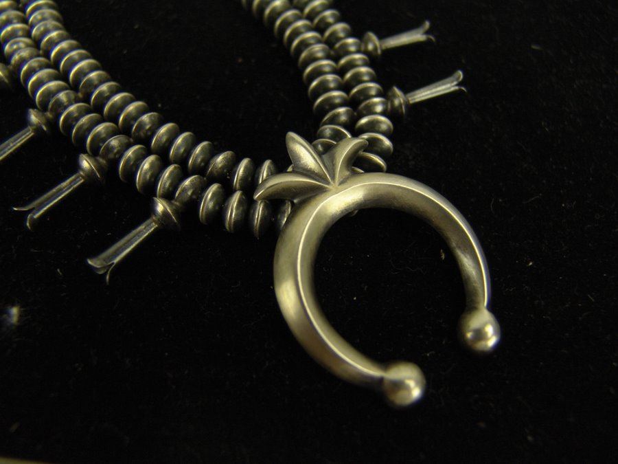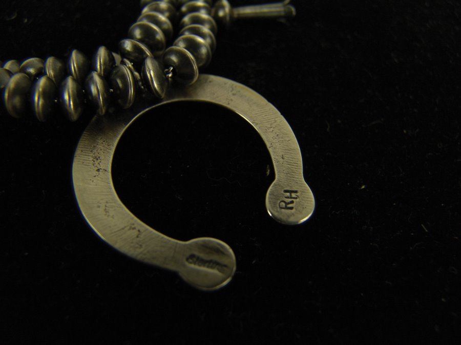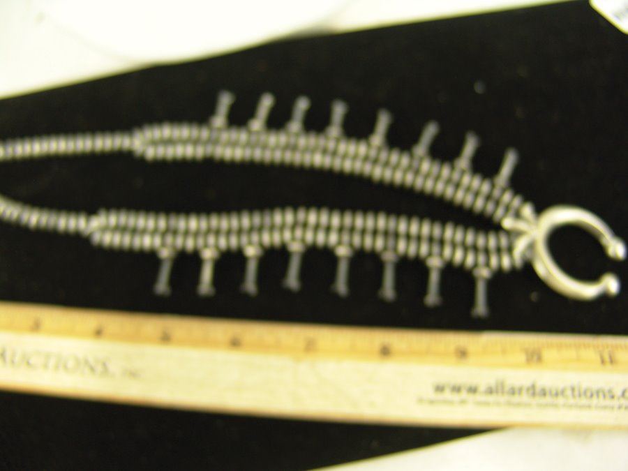 Very fine, petite sized all silver squash blossom necklace with tiny pinched bench made beads, long graceful blossoms, and small sandcast horseshoe naja. Very good condition, very fine.,Late 1900s,24"